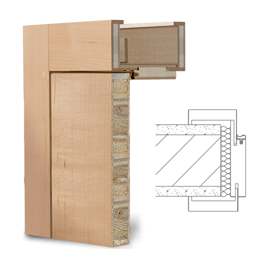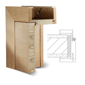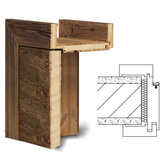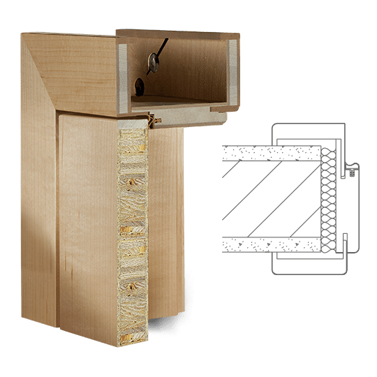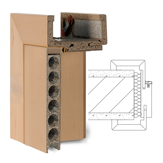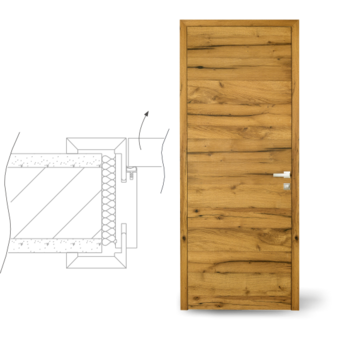 Rám z masivního dřeva lepeného v několika vrstvách, povrch dýhovaný pravým dřevem nebo lakovaný dle RAL/NCS, dveřní panty Tectus 340, protiplech zámku na magnetickou západku, standardní šířka rámu 80 mm, tloušťka rámu 60 mm, možné přiobjednat krycí lišty montážního otvoru.