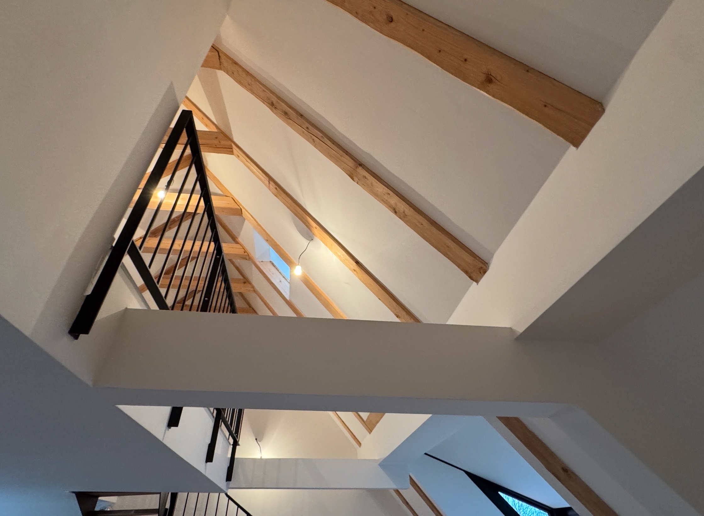 Kombinace táhlového zábradlí podél schodiště a celoskleněného zábradlí v horním patře. Skleněné zábradlí propouští světlo a udržuje prostor vzdušný, zatímco závěsná konstrukce zajišťuje stabilitu.