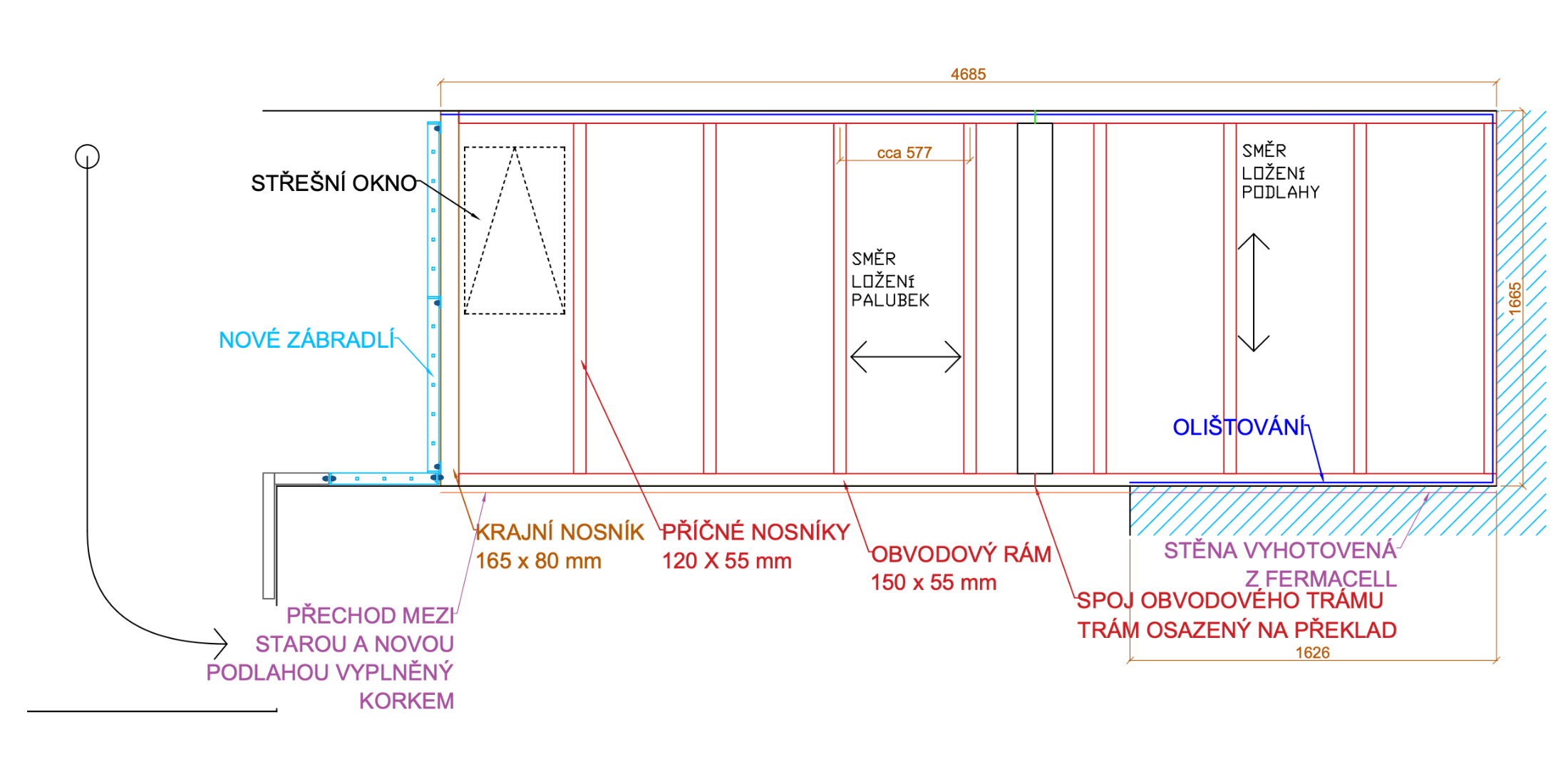 Celý systém zábradlí byl řešen jako kombinace ocelové konstrukce s dřevěným madlem, přičemž důraz byl kladen na ergonomii a plynulost napojení jednotlivých segmentů.