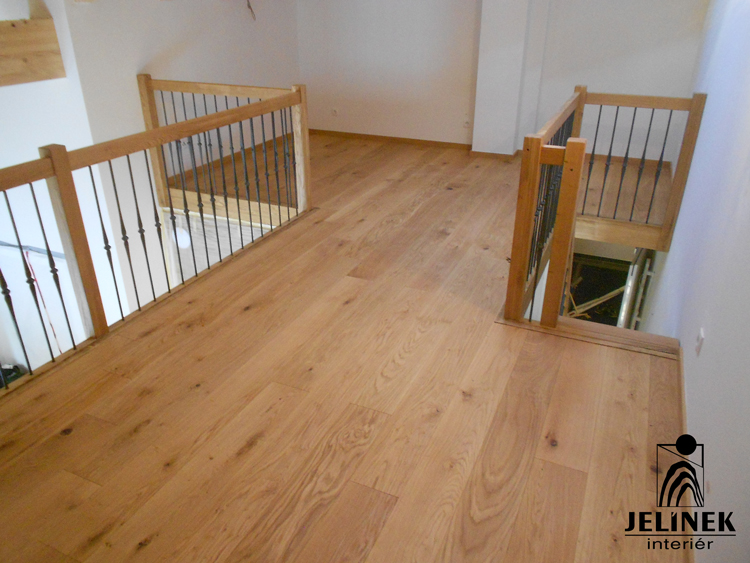 Dřevěné zábradlí, dubové dřevěné schody, masivní dubové podlahy a masivní interiérové dveře v dokonalé harmonii barev s důrazem na masivní dubové dřevo.