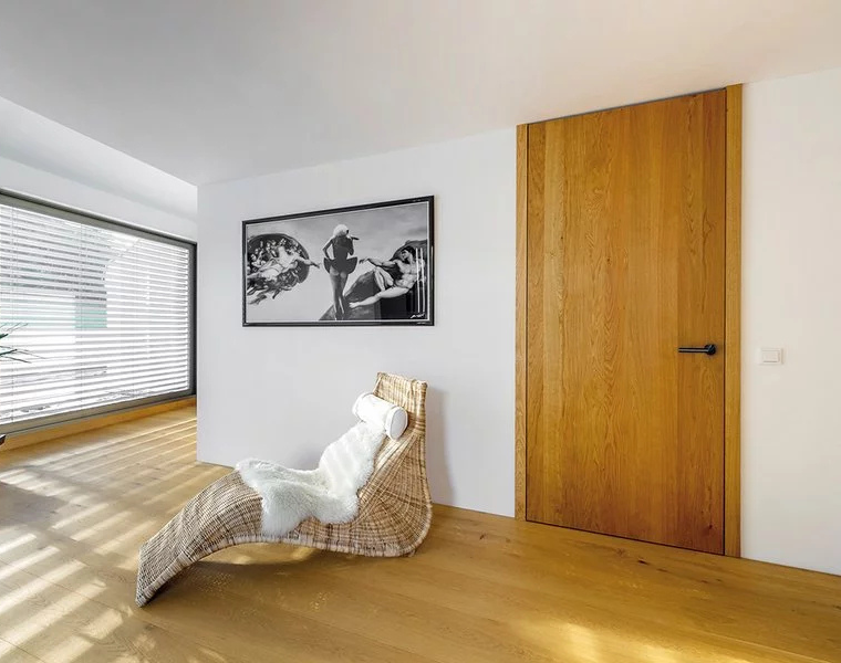 Rám neviditelný zabudovaný v ostění a dveřní křídlo v jedné rovině se stěnou, hliníkový rám FLAT jako neviditelný rám pro omítku a sádrokarton včetně omítkové sítě a montážních držáku, Sada lišt z masivního dřeva s hliníkovými dveřními panty Tectus 340, určeno pro magnetickou západku, hliníkový rám je umístěn v přední části zarovno s omítkou.