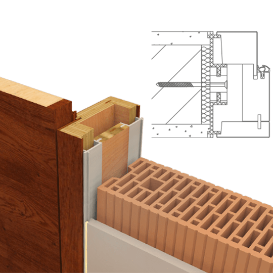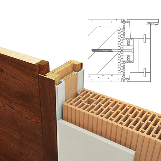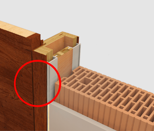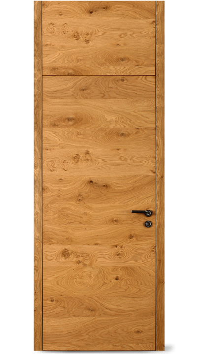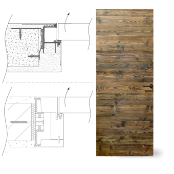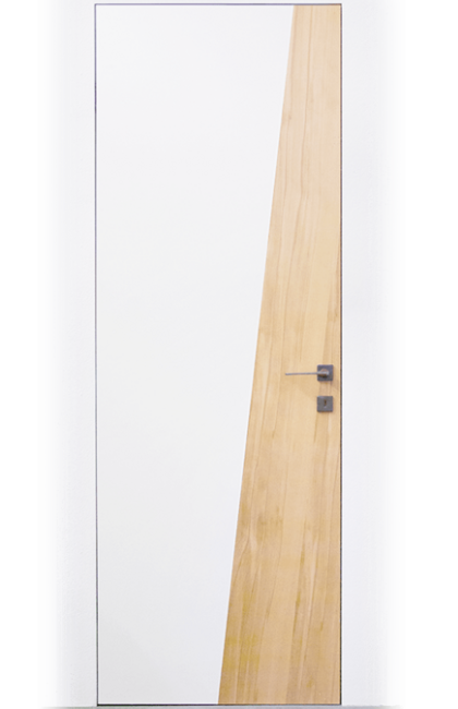 Rám neviditelný zabudovaný v ostění a dveřní křídlo v jedné rovině se stěnou, dveřní křídlo se otevírá ve směru do ostění stěny (reverzní). Hliníkový rám FLAT-IN jako zapuštěný rám pro omítku a nebo sádrokarton včetně omítkové sítě a montážních držáku. Sada lišt z masivního dřeva a s dveřní panty Tectus 240, protiplech pro magnetickou západku, hliníkový rám je umístěn v přední části zarovno s omítkou.