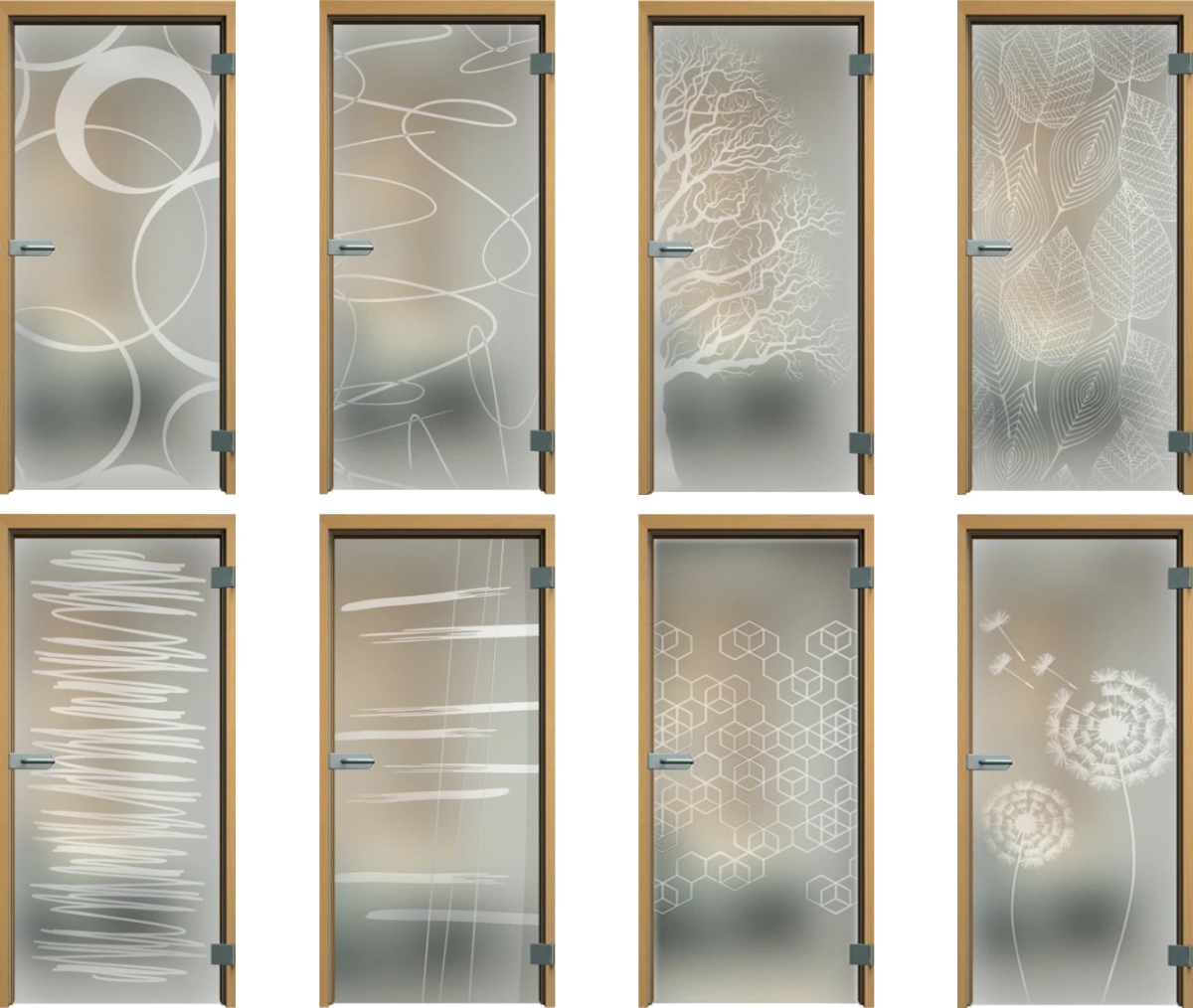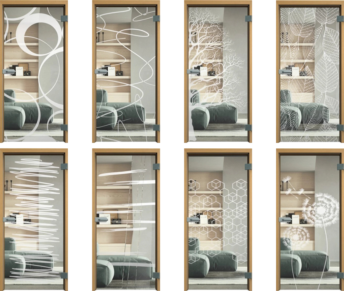 Čiré celoskleněné dveře s dopískovaným vzorem. Celoskleněné dveře dodají interiéru nadčasovou eleganci, prosvětlí prostor a opticky ho zvětší, aniž by narušily soukromí. - V ceně skla je vrtání otvorů pro madlo nebo úchyt z naší nabídky - V ceně skla není započítána zárubeň, ta je nutná objednat zvlášť - vyberte si z nabídky zárubní pro skleněné dveře