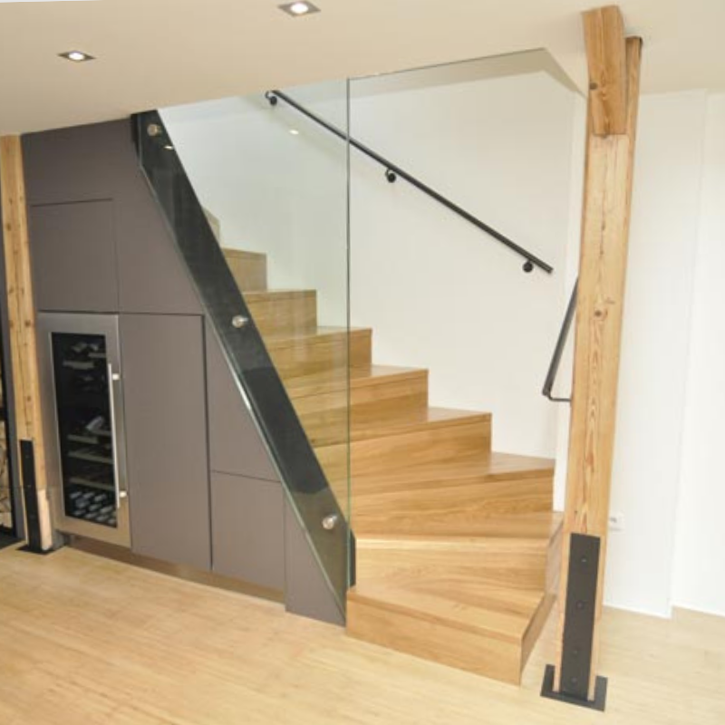 Moderní schodiště z masivu se skleněným zábradlím Zakázková výroba dřevěného schodiště v kombinaci s bezpečnostním sklem a kovovými prvky. Realizace zahrnuje prosklenou galerii, integrovanou vinotéku pod schody a designové osvětlení. Ideální řešení pro moderní podkrovní byty a rodinné domy, které hledají rovnováhu mezi designem a funkčností.