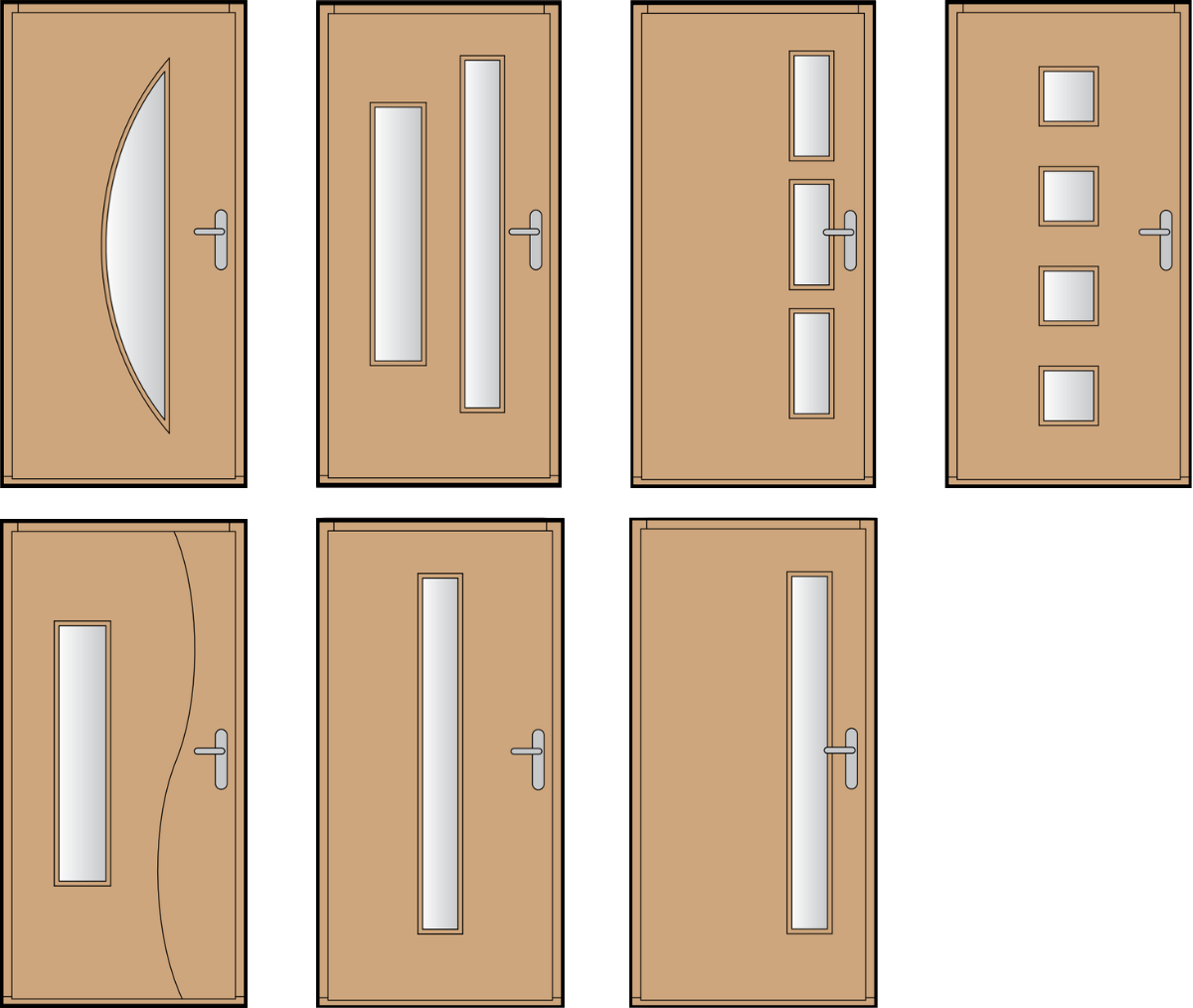 Svislé obdélníkové prosklené tabule v různých rozměrech a množstvím dekorativního umístění dokonale sjednotí každý interiér, jehož dominanty jsou ostré křivky. Prosklené varianty navíc slibují dostatek světla v chodbě, či předsíni.
