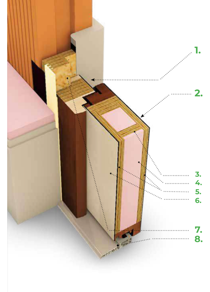 – kovové desky uvnitř a zvenčí pod finální povrchovou vrstvou → dodatečný stabilizátor, ochrana proti proražení a zvýšená bezpečnost - 3