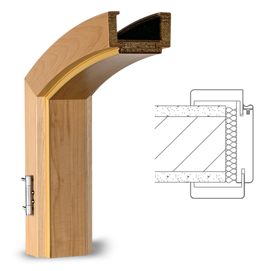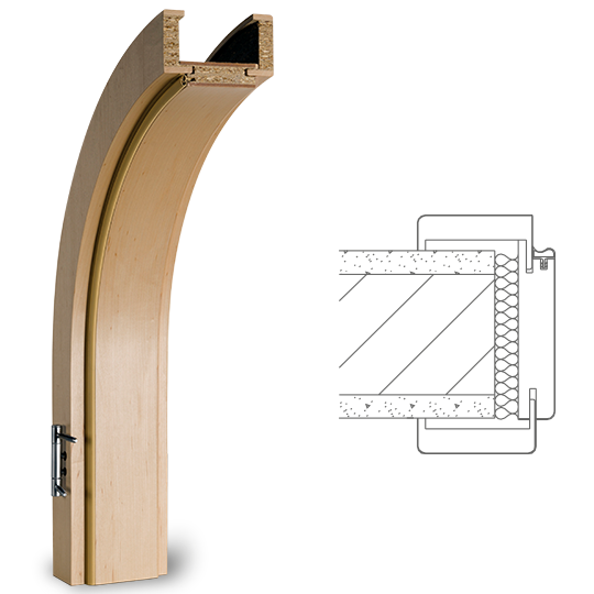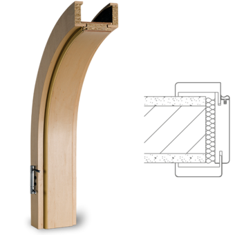 Zárubeň z masivního dřeva lepený ve více vrstvách s MDF vrchní vrstvou, povrch dýhovaný pravým dřevem nebo lakovaný dle RAL/NCS, 3dílné dveřní panty, protiplech s výměnnou vložkou nastavitelný do 4 poloh, standardní hrany profilu B (zaoblené) , šířka obložky 75 mm, rozsah nastavení +/- 5 mm, kompletně smontované a lakované, segmentový oblouk.