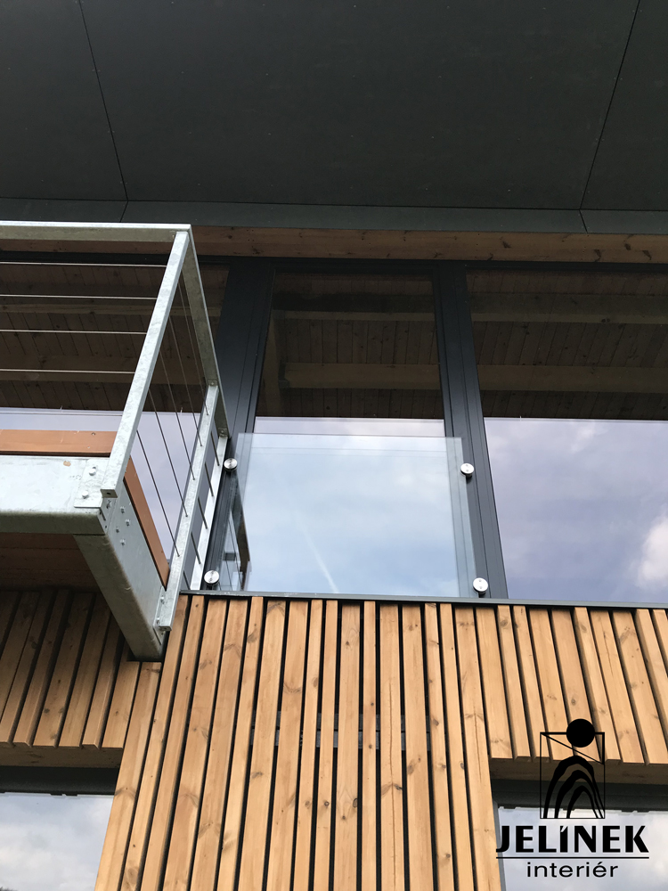 Toto moderní zábradlí na balkoně či terase využívá minimalistickou kombinaci skla, kovu a dřeva, která ladí s celkovým dřevěným obložením fasády. Hlavní výplň tvoří tabule čirého bezpečnostního skla, které jsou uchyceny pomocí systémových nerezových či hliníkových svorek k svislým sloupkům lakovaných do černé barvy RAL.