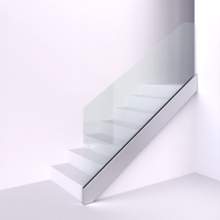 Celoskleněné zábradlí je kotveno do subtilní lišty mezi schodnicemi. Skleněná plocha vytváří čistý vzhled, opticky odlehčuje prostor a přitom zajišťuje bezpečnost.