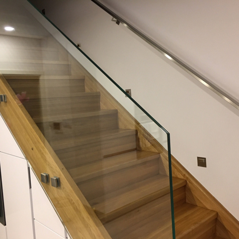 Realizovali jsme celoskleněné zábradlí podél schodiště s masivním dubovým madlem.
