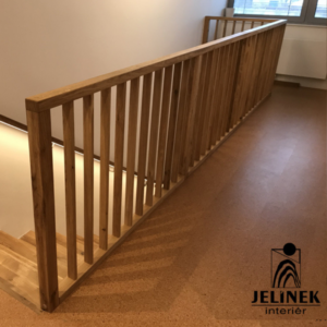 Obklad schodiště s dubovým zábradlím s hranatou vertikální výplní