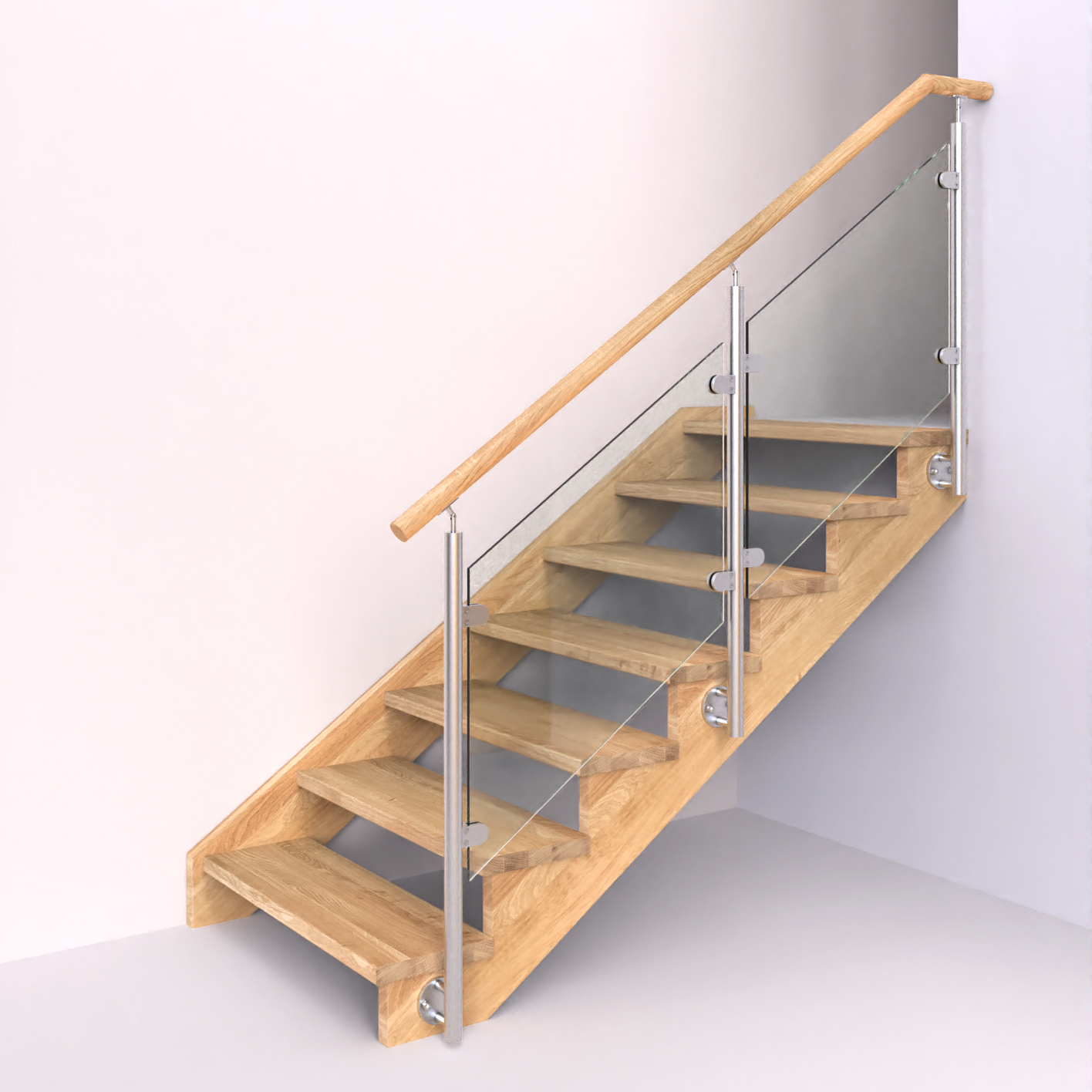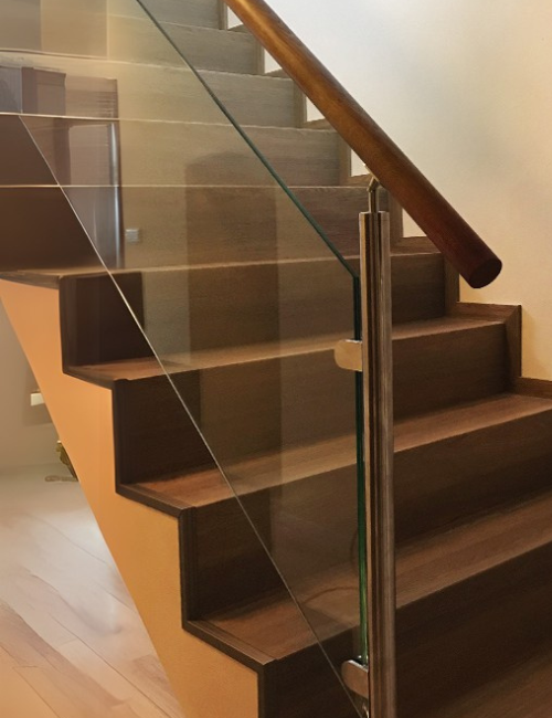 Celoskleněné zábradlí kotvené do stupňů slibuje minimalistický design a maximální bezpečnost. Perfektní řešení pro schodiště.