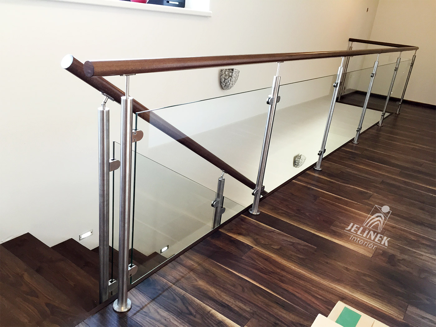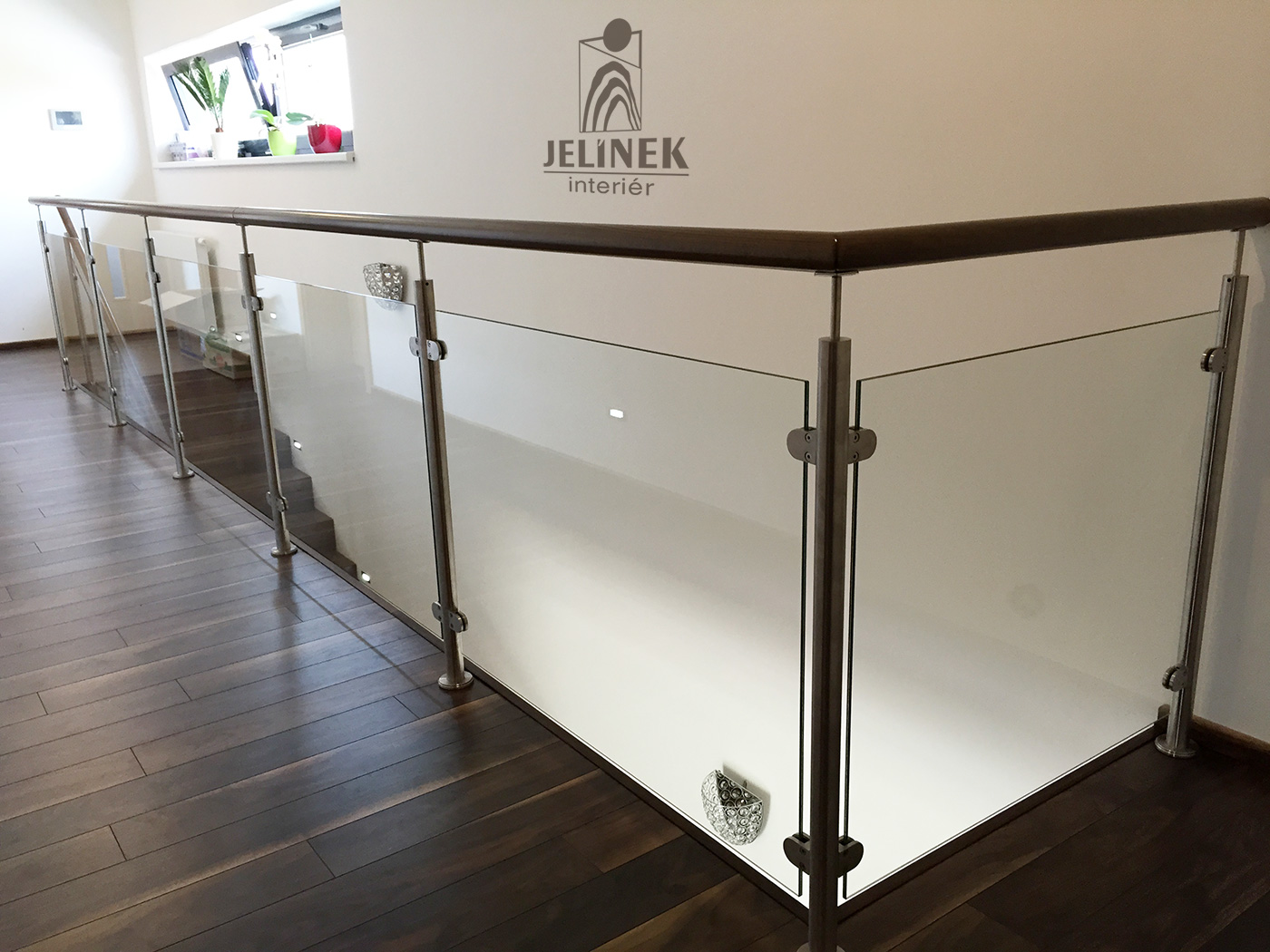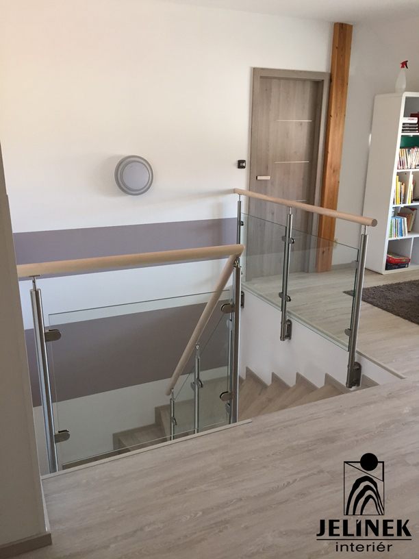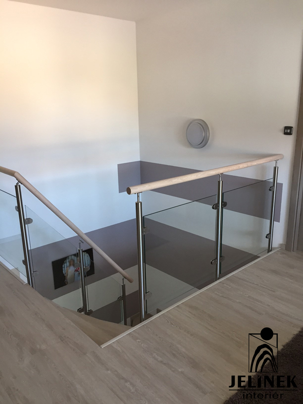 Skleněné zábradlí s dubovým madlem