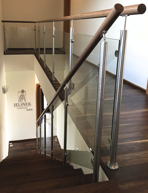 Realizovali jsme celoskleněné zábradlí podél schodiště s masivním dubovým madlem.
