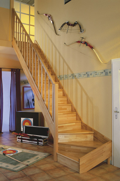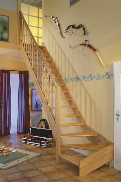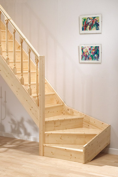 Dřevěné schody a jejich úhel zatočení je optimalizován v harmonii s poskytnutým místem pro schodiště, včetně jeho celkové konstrukční výšky.