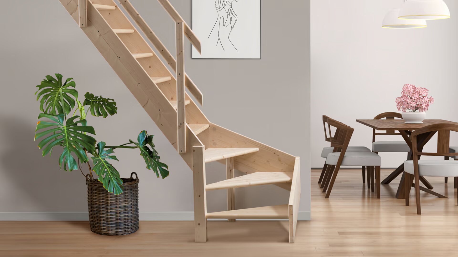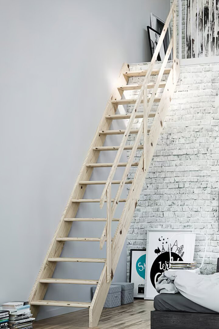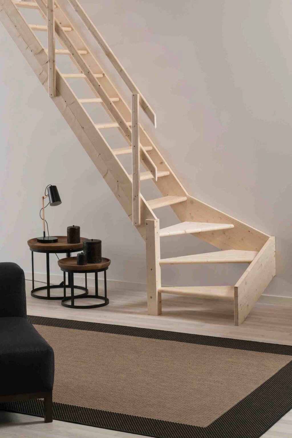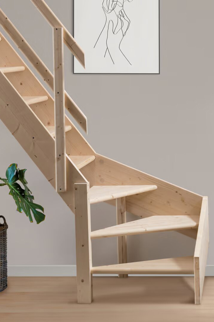 Dřevěné schody a jejich úhel zatočení je optimalizován v harmonii s poskytnutým místem pro schodiště, včetně jeho celkové konstrukční výšky.
