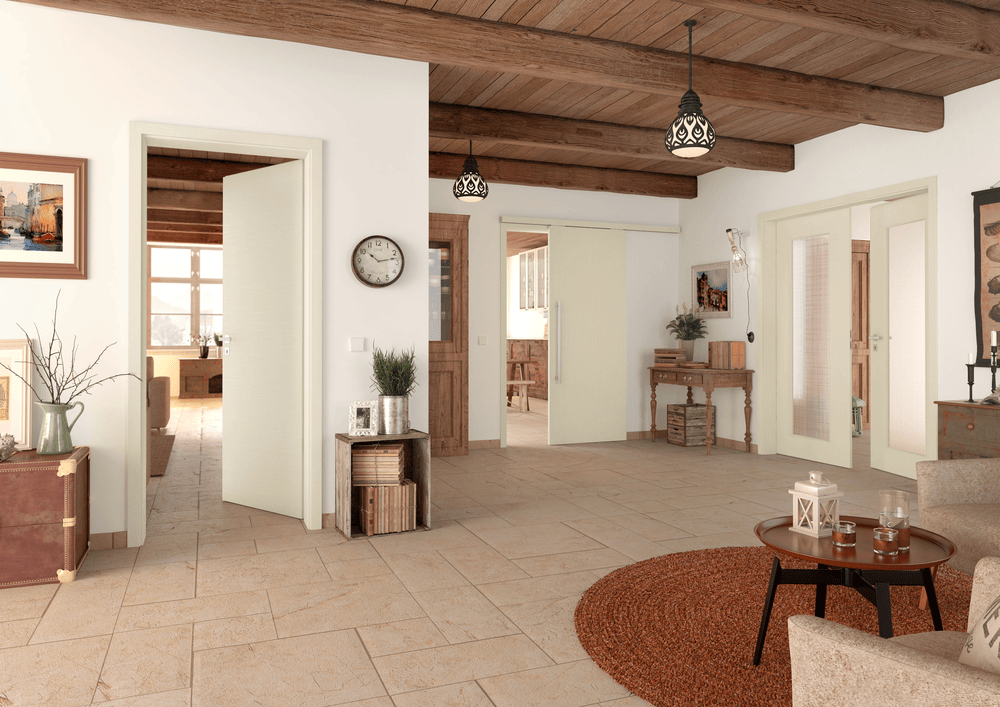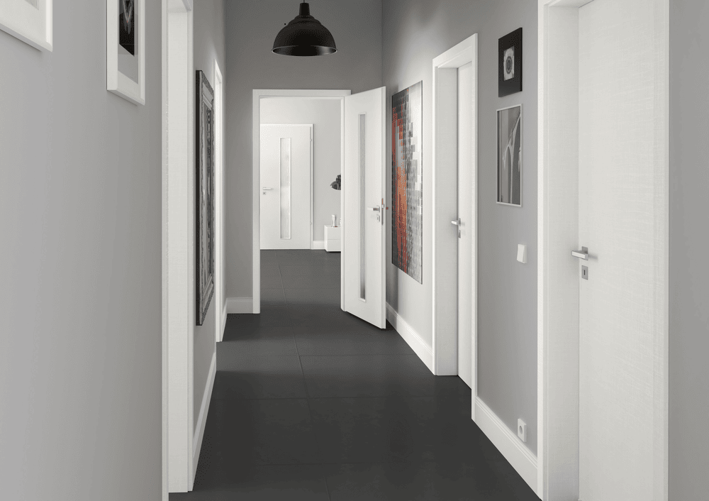 Neobvyklé provedení interiérových dveří s průchozím otvorem v plné světlé výšce místnosti. Takovéto dveře v interiéru navozují vyšší míru luxusu a krásně propojují jednotlivé místnosti.