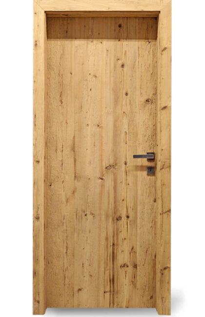 – Dveřní křídlo z masivního smrkového jádra je potažené překryvnými vrstvami z masivního dřeva.