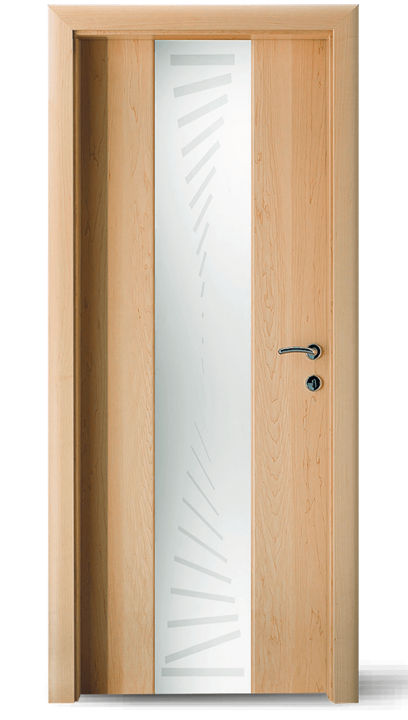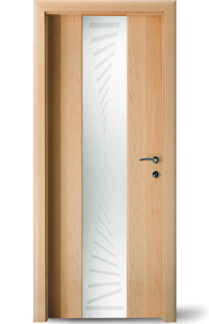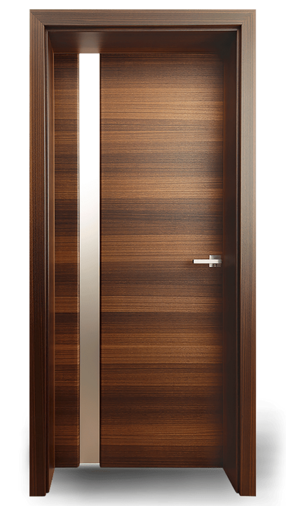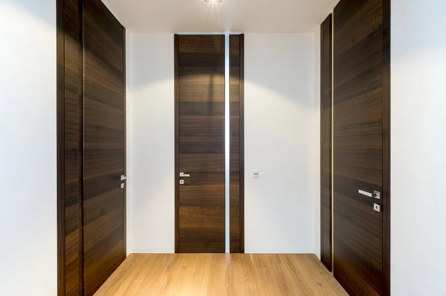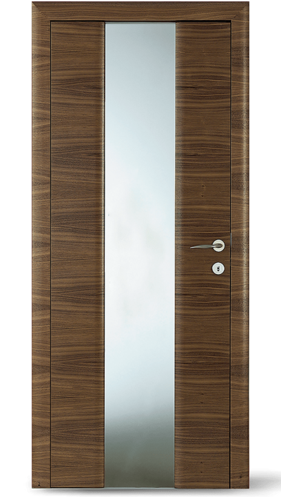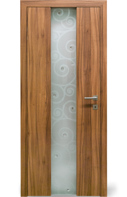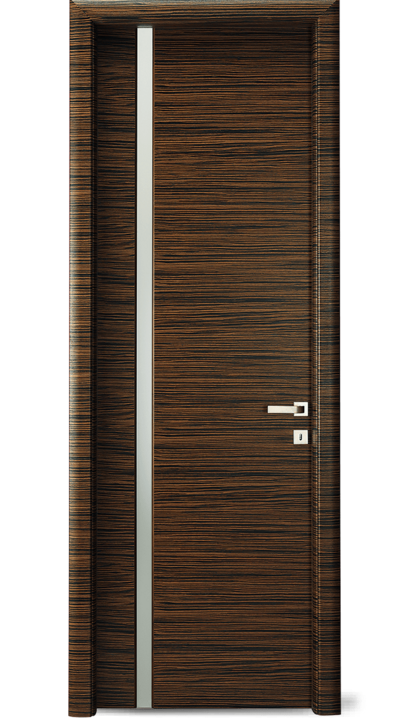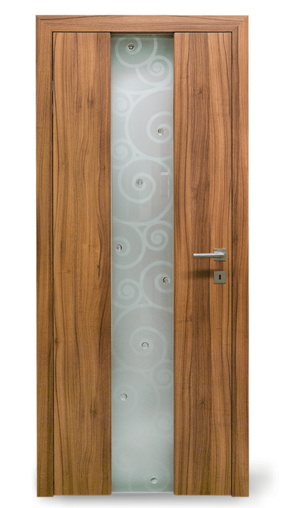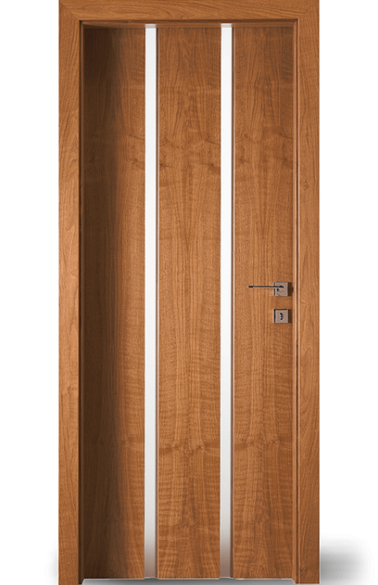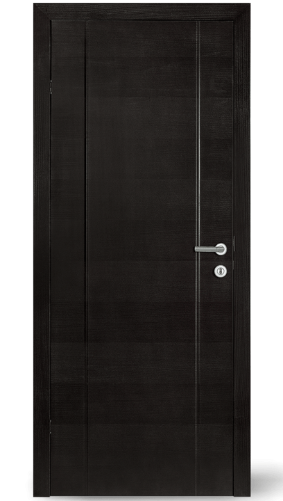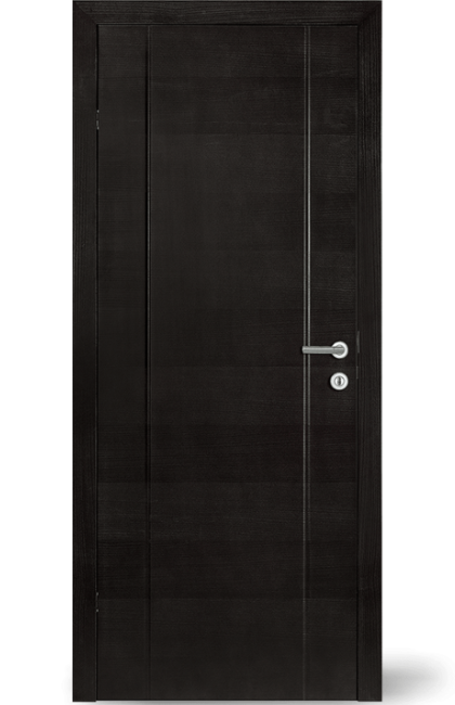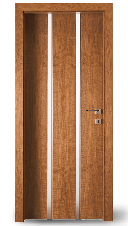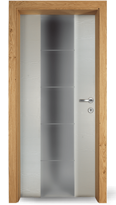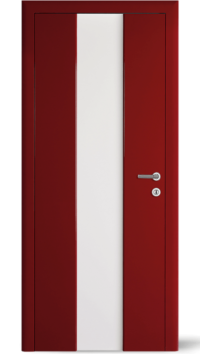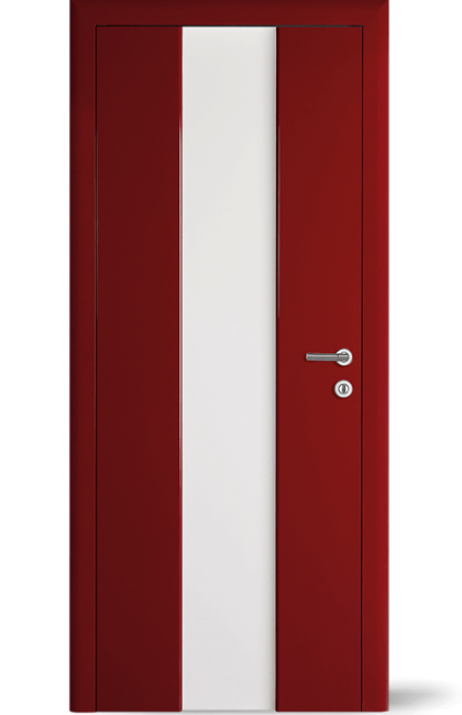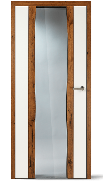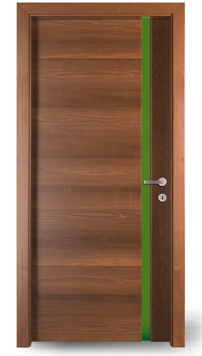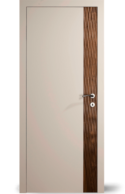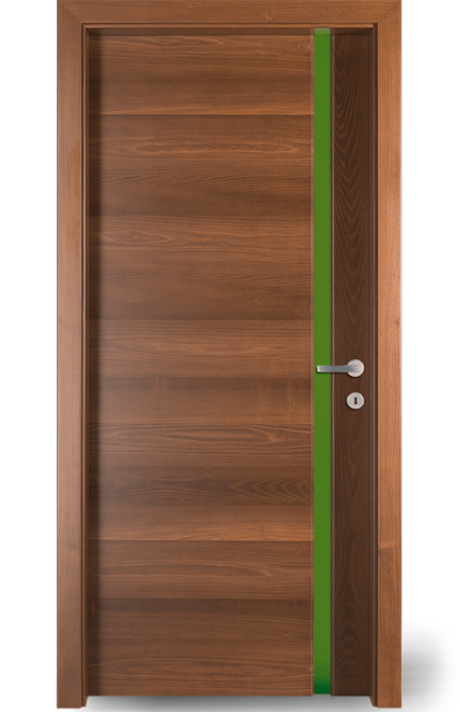 Vysoce kvalitní dveře s barevnou vložkou v jedné rovině s povrchem. Volitelně může být vložka navržena také s vlnovým frézováním (dřevo nebo barevný lak) nebo se vzhledem surové dřevěné hrany.