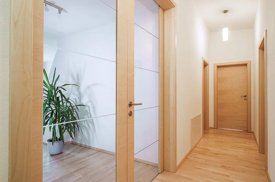 Realizace interiérových dveří PRÜM – Světlý dub, tmavý dub a celoskleněné