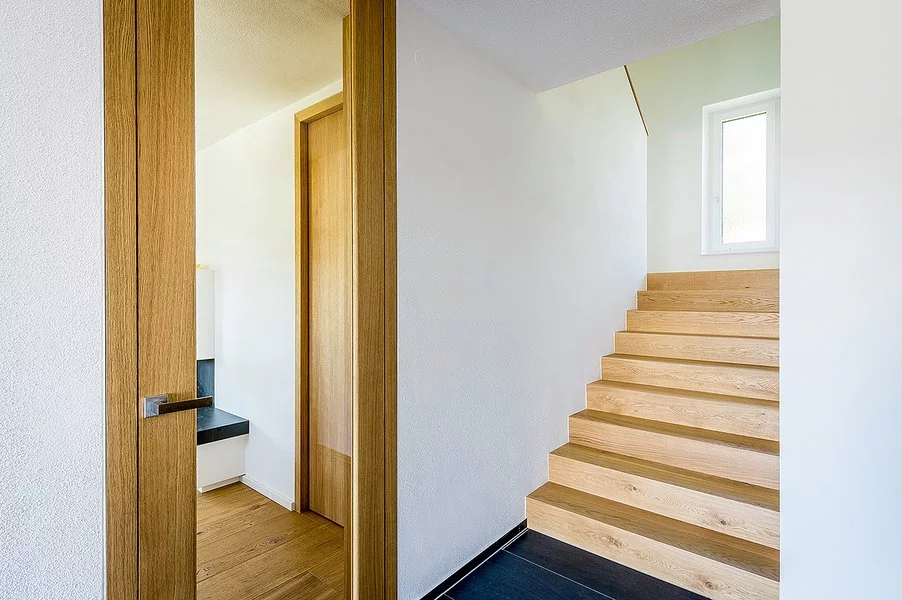 Bukové dřevo dodává prostoru teplo a přirozený vzhled, zatímco samonosná konstrukce zajišťuje stabilitu. Tato realizace vyřešila přístup do druhého patra v mezonetovém podkrovním bytě.