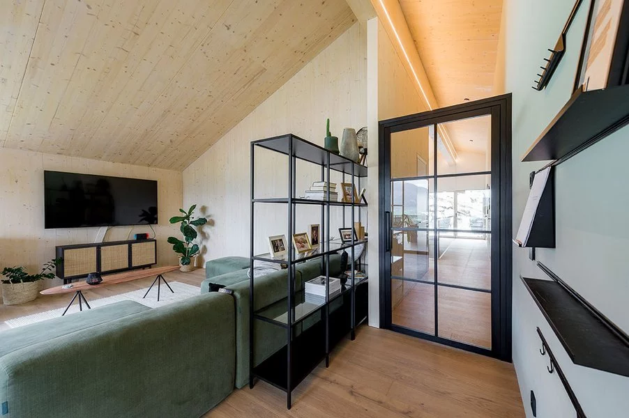 Bukové dřevo dodává prostoru teplo a přirozený vzhled, zatímco samonosná konstrukce zajišťuje stabilitu. Tato realizace vyřešila přístup do druhého patra v mezonetovém podkrovním bytě.