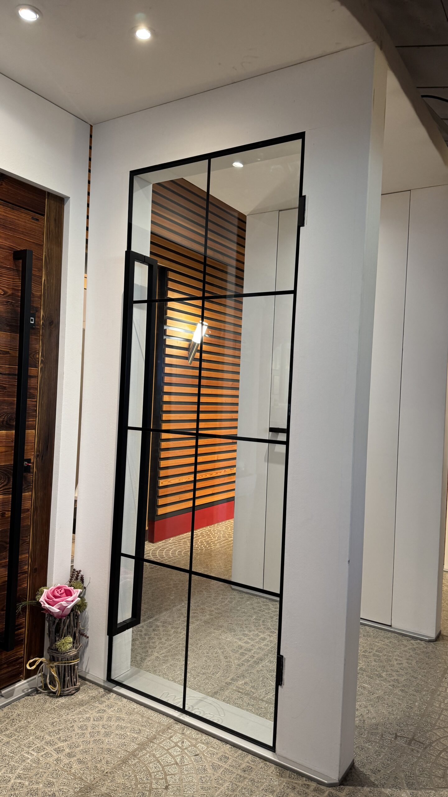 Neobvyklé provedení interiérových dveří s průchozím otvorem v plné světlé výšce místnosti. Takovéto dveře v interiéru navozují vyšší míru luxusu a krásně propojují jednotlivé místnosti.