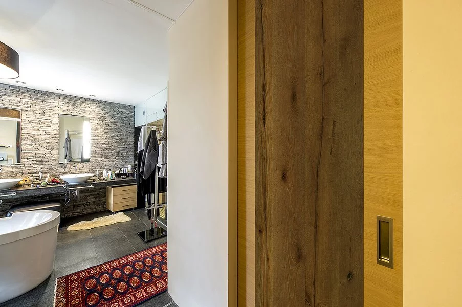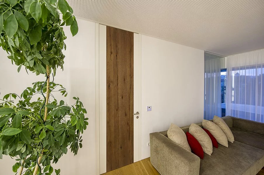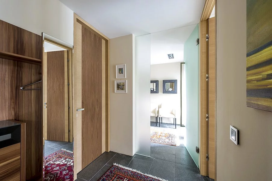 Neobvyklé provedení interiérových dveří s průchozím otvorem v plné světlé výšce místnosti. Takovéto dveře v interiéru navozují vyšší míru luxusu a krásně propojují jednotlivé místnosti.