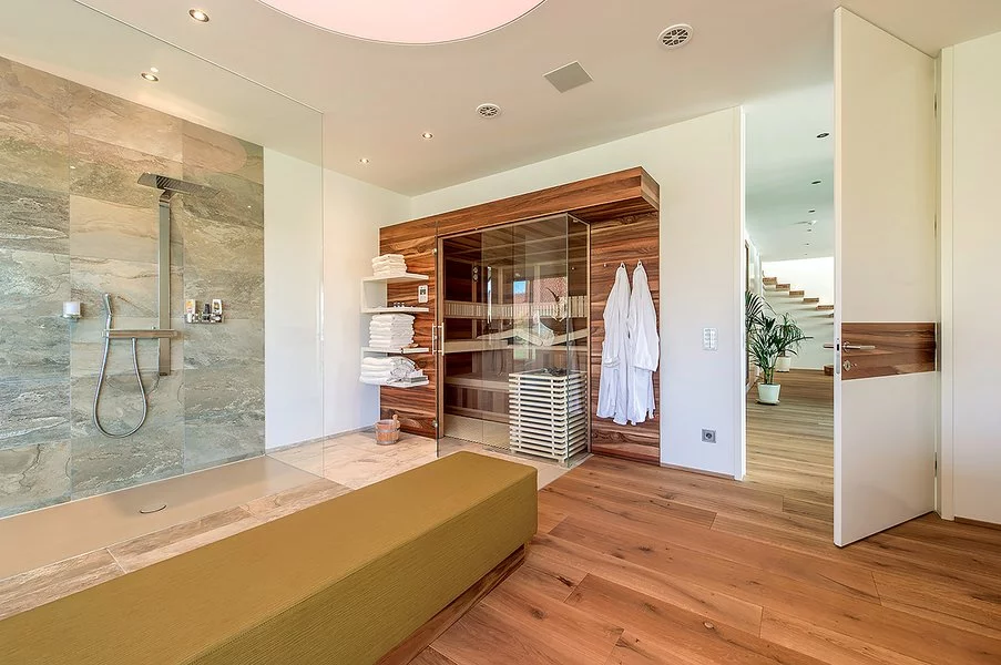 Moderní schodiště z masivu se skleněným zábradlím Zakázková výroba dřevěného schodiště v kombinaci s bezpečnostním sklem a kovovými prvky. Realizace zahrnuje prosklenou galerii, integrovanou vinotéku pod schody a designové osvětlení. Ideální řešení pro moderní podkrovní byty a rodinné domy, které hledají rovnováhu mezi designem a funkčností.