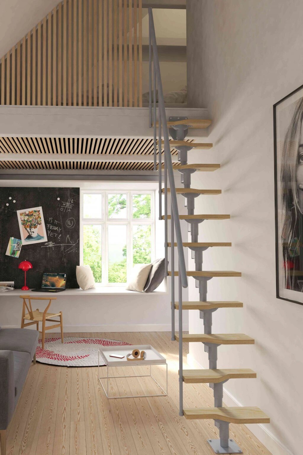 Konstrukce tohoto schodiště nevyžaduje podpěry, což umožňuje volný průchod světla a zachovává pocit prostornosti. V tomto konkrétním případě je vertikální výplň tvořena ocelovými pruty, což schodišti dodává industriální dotyk.