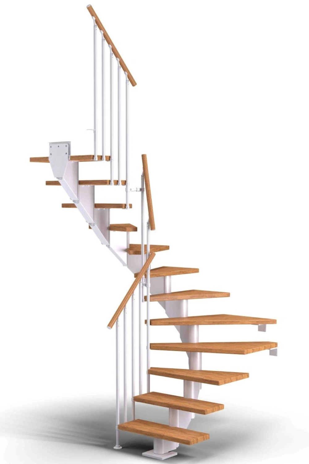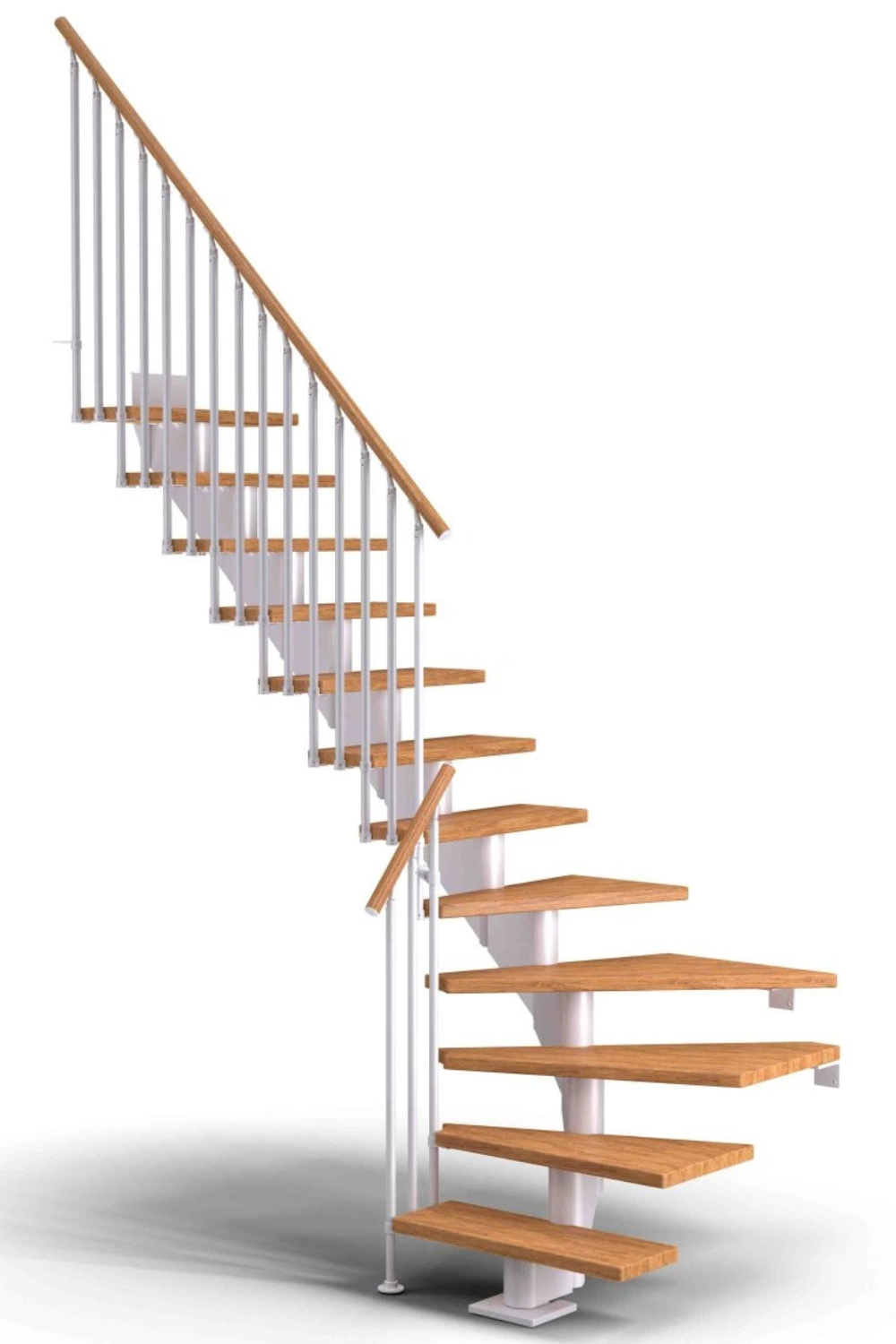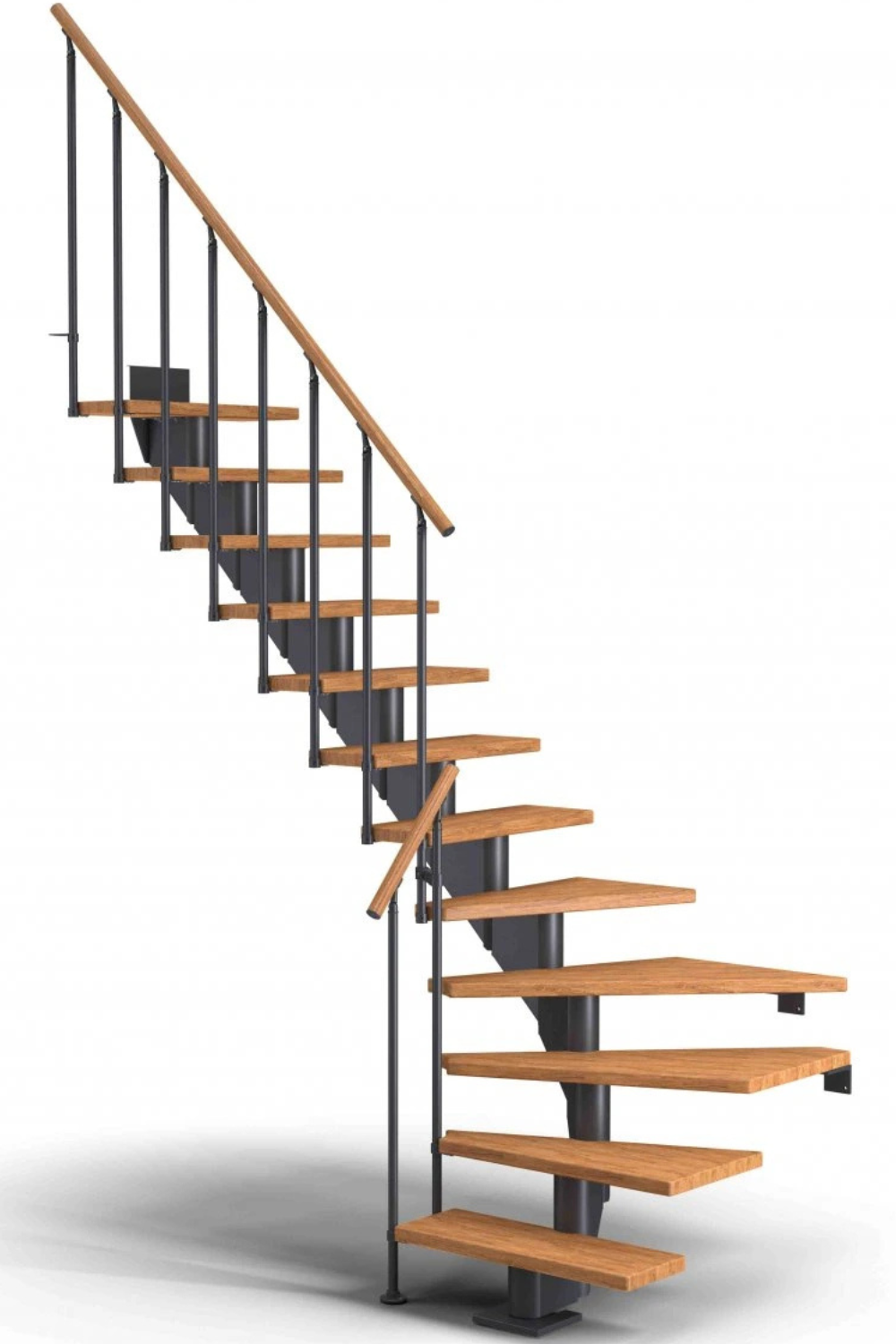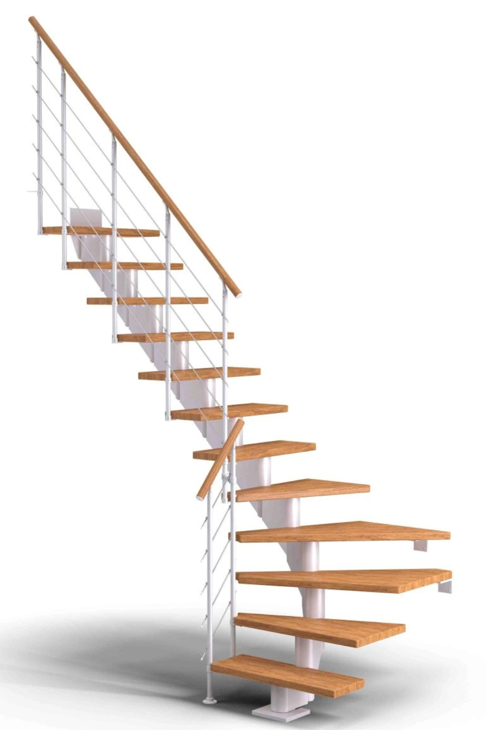 Dřevěné schody a jejich úhel zatočení je optimalizován v harmonii s poskytnutým místem pro schodiště, včetně jeho celkové konstrukční výšky.