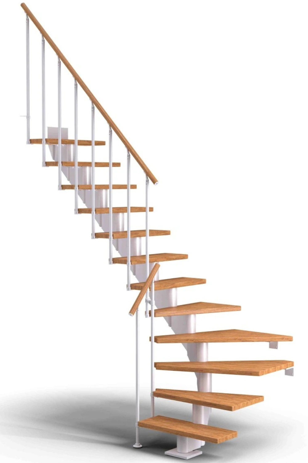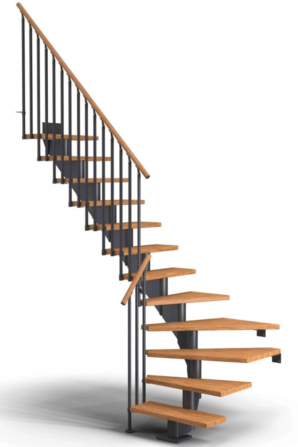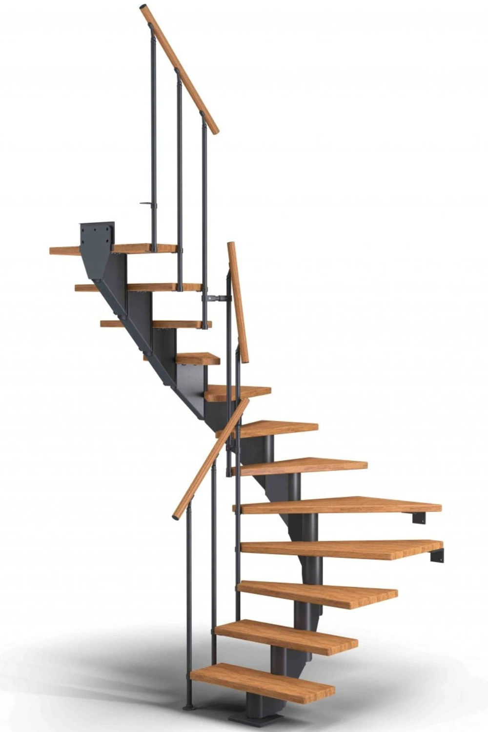 Dřevěné schody a jejich úhel zatočení je optimalizován v harmonii s poskytnutým místem pro schodiště, včetně jeho celkové konstrukční výšky.