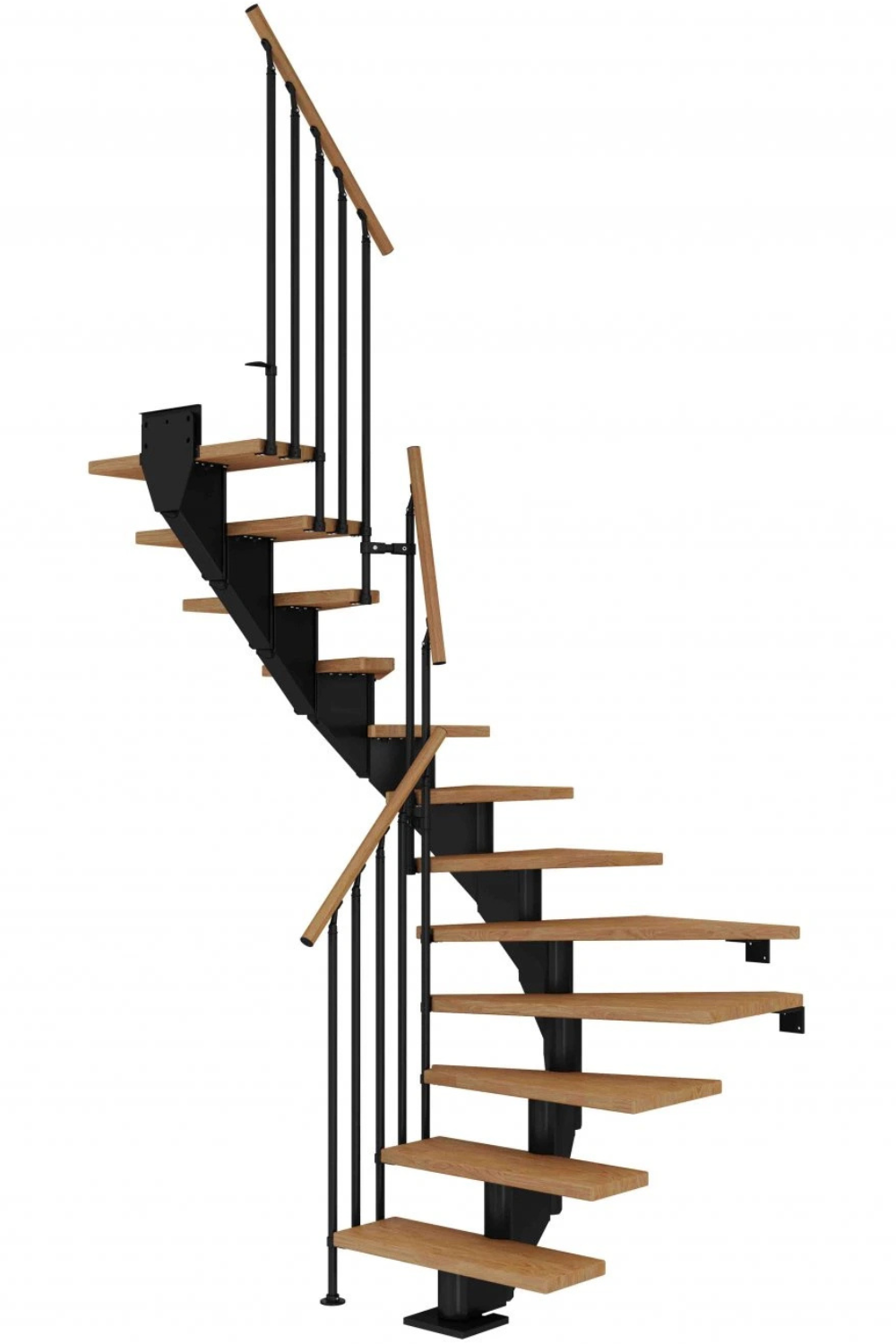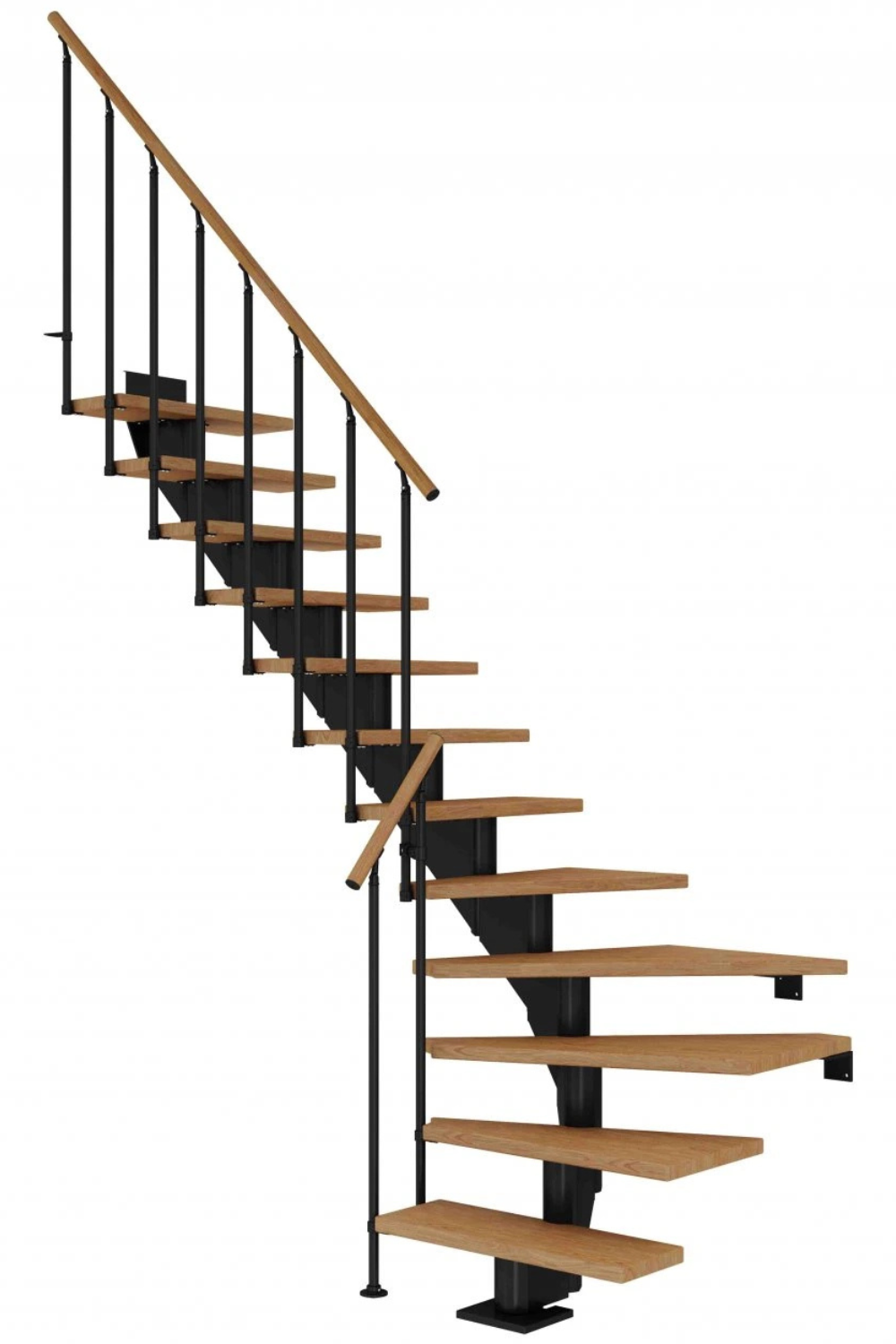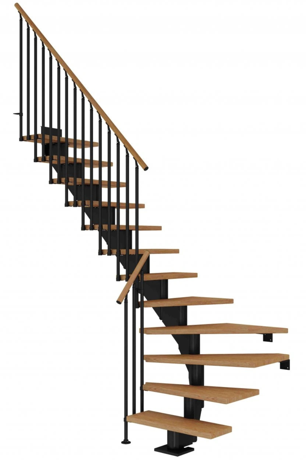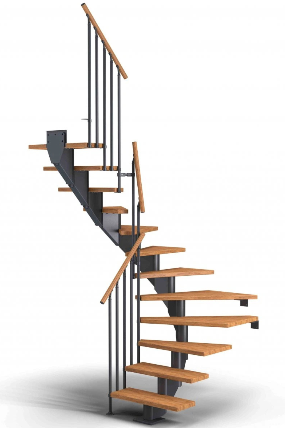 Dřevěné schody a jejich úhel zatočení je optimalizován v harmonii s poskytnutým místem pro schodiště, včetně jeho celkové konstrukční výšky.