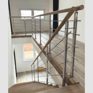 Představujeme náš nejžádanější typ nerezového zábradlí s prutovou výplní, které kombinuje nadčasový design s precizním zpracováním dřevěného madla v odstínu interiéru. Tato realizace zahrnuje také obklad schodiště z masivního dubu v provedení RUSTIK, který vytváří elegantní a harmonický celek s nerezovou konstrukcí.