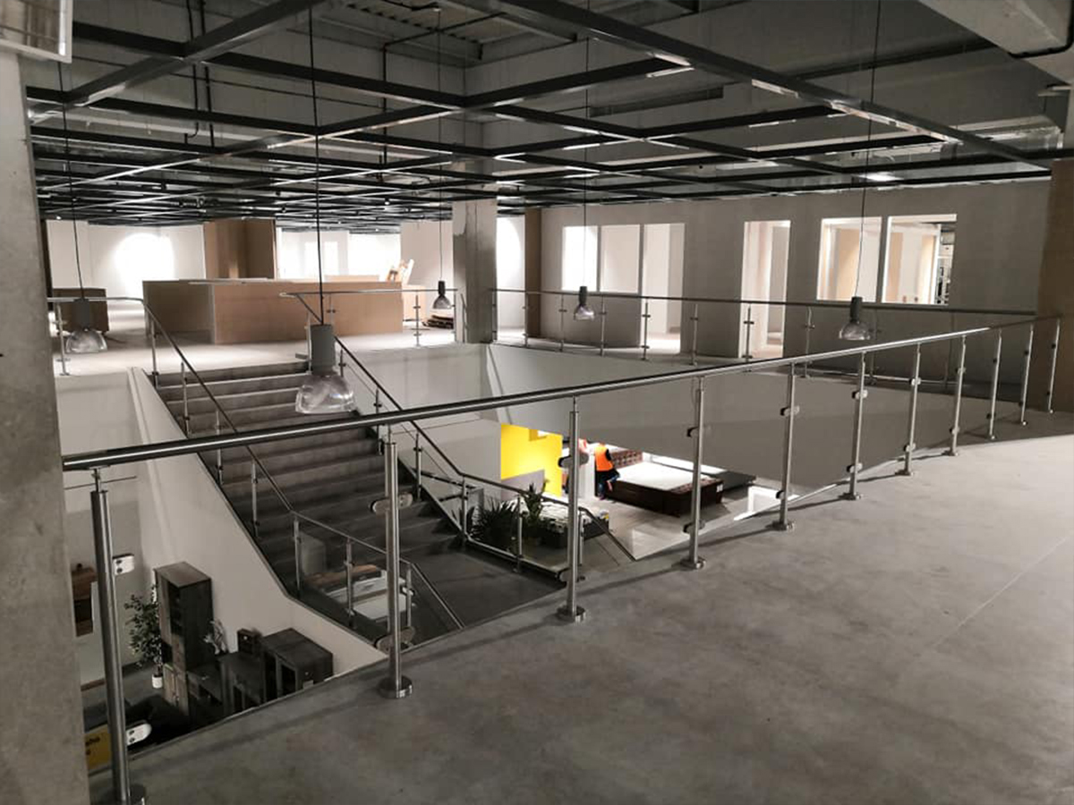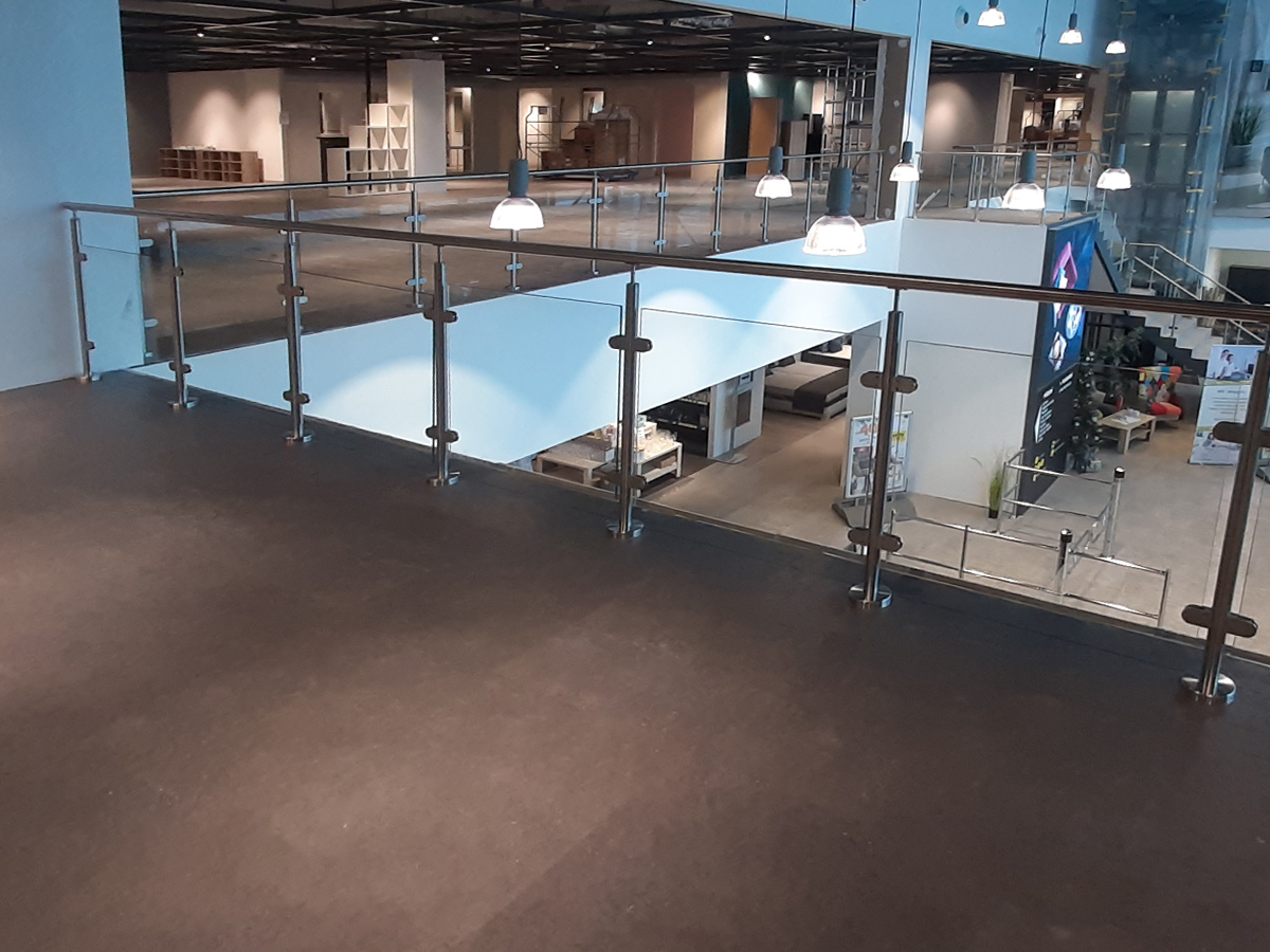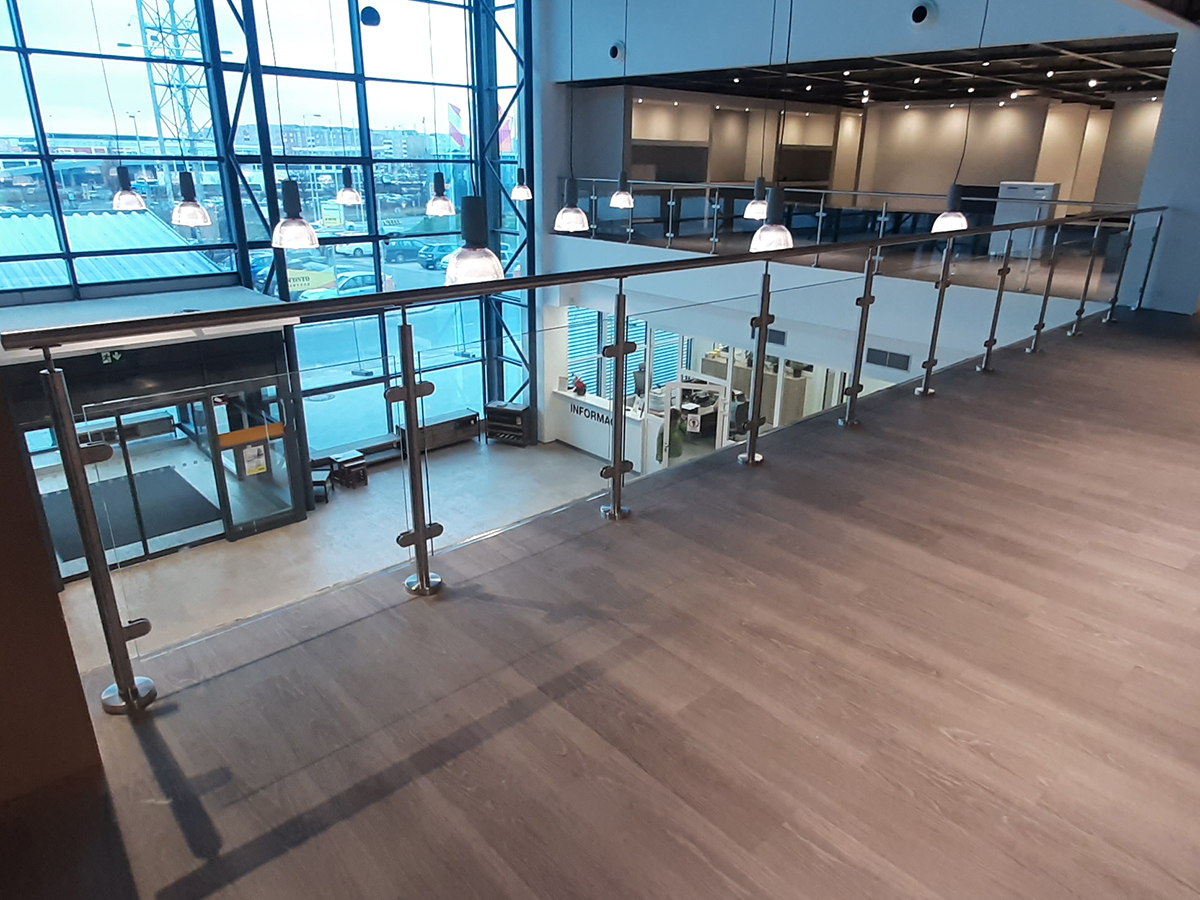 V této zakázce jsme realizovali skleněné zábradlí s ocelovými puky jako způsobem kotvení v komerčních prostorech.