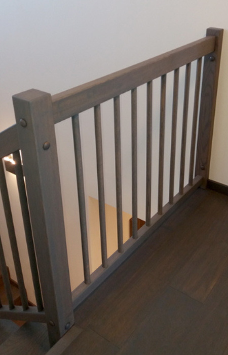 Klíčovým prvkem této realizace je spojení masivních stupňů a zábradlí s kulatými příčkami, které interiéru dodávají vzdušnost a moderní vzhled.
