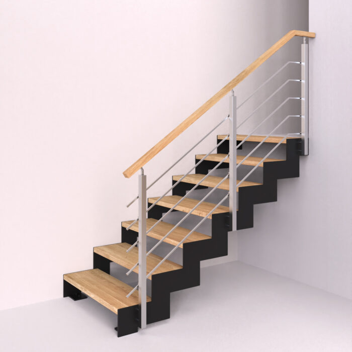 Kombinace zubatice z oceli, masivních dřevěných stupňů a nerezového zábradlí s vodorovnou prutovou výplní. Možnost výběru dřeviny a povrchové úpravy nerezu. Výroba na míru v naší české dílně.
