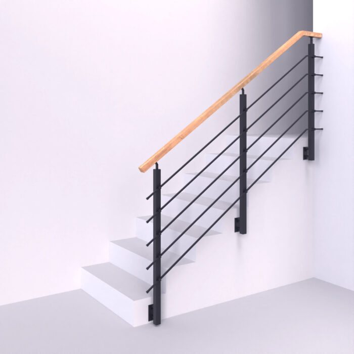 Toto ocelové zábradlí využívá hranaté sloupky a vodorovnou výplň, která podtrhuje moderní vzhled a zajišťuje stabilitu. Ocelové části lze nalakovat do odstínu RAL, takže je snadno sladíte s interiérem.