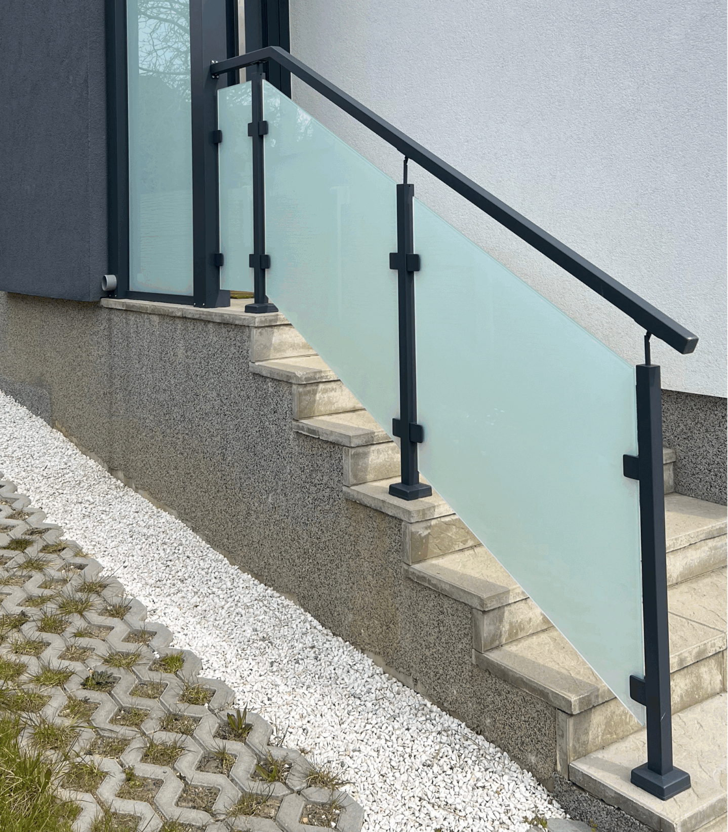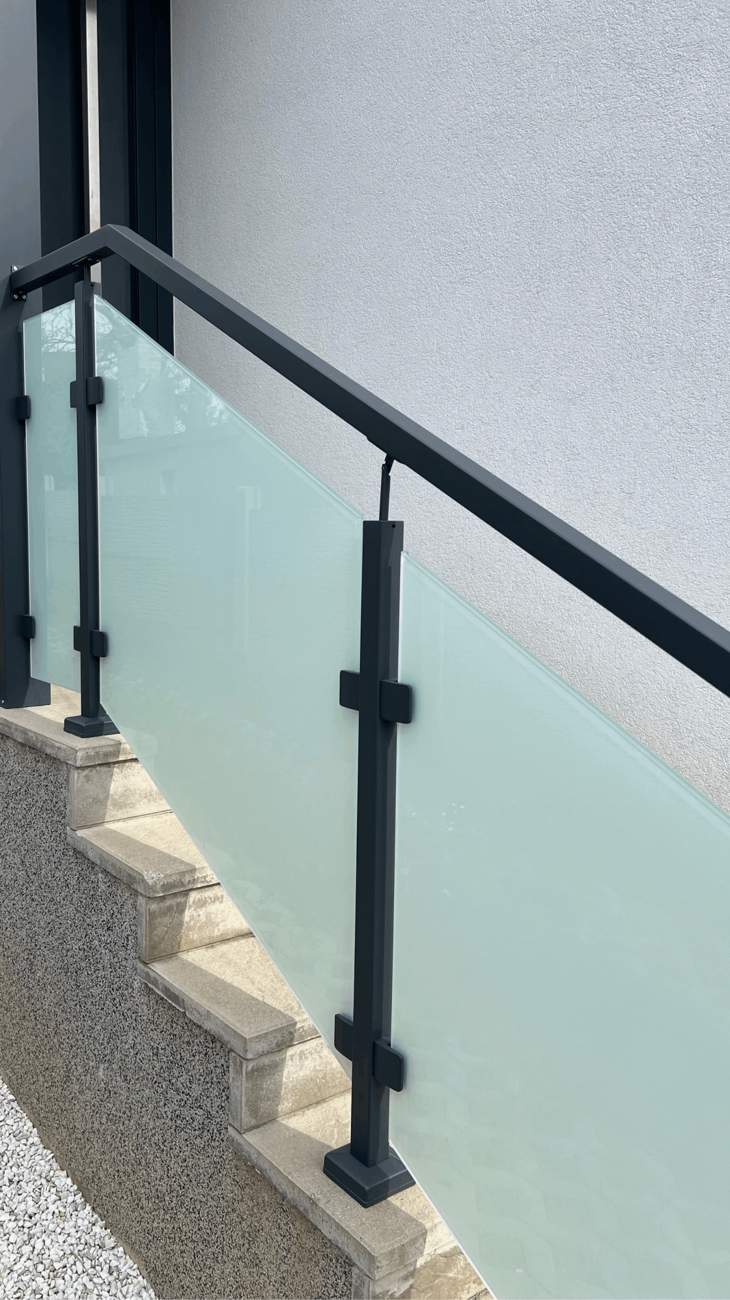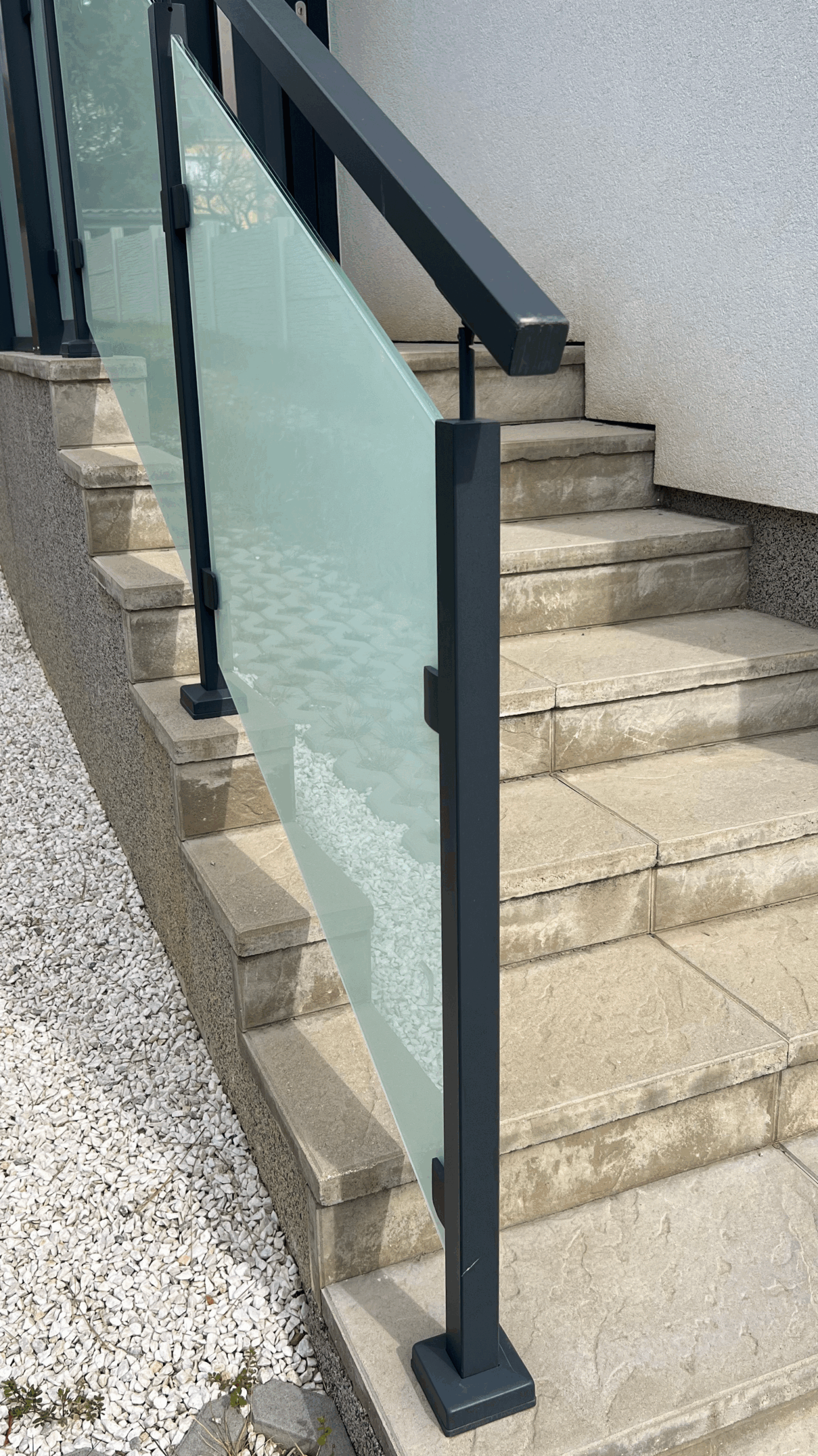 Černé ocelové hranaté zábradlí s mléčným sklem