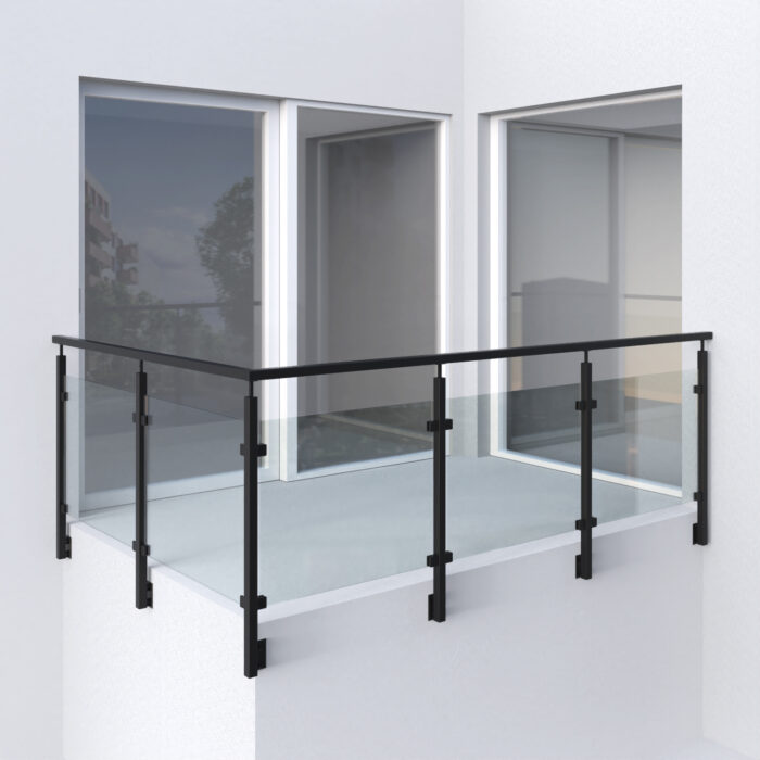 Ocelové zábradlí na balkón – Černé hranaté sloupky se skleněnou výplní