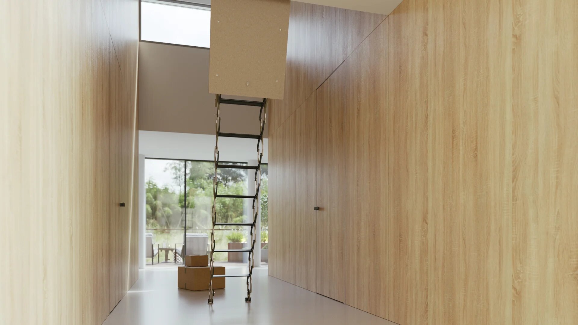- Stahovací půdní schody VERTICALE s jednoduchým dřevotřískovým víkem pro zabudování do stěny.