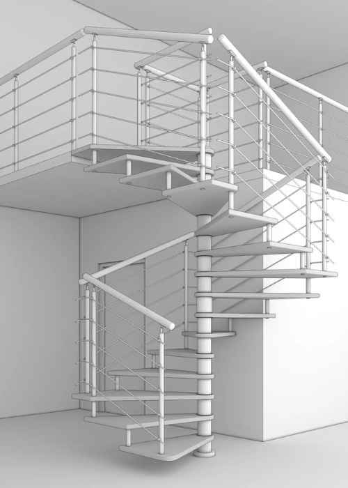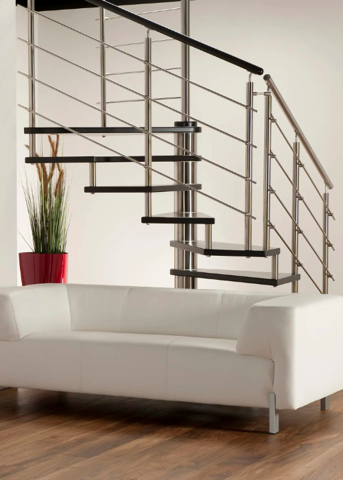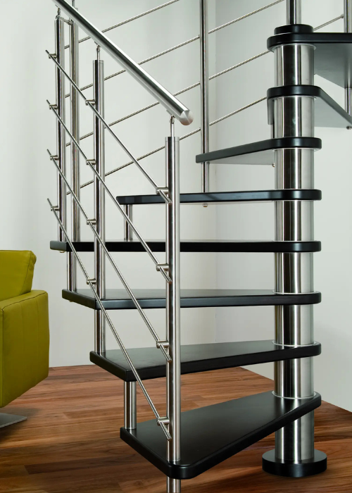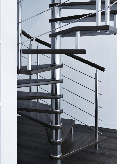 Nerezové točité schodiště MAX SQ s atypickým čtvercovým půdorysem je vhodné do téměř jakéhokoliv interiéru. Schodišťový stupeň je z masivního bukového dřeva.