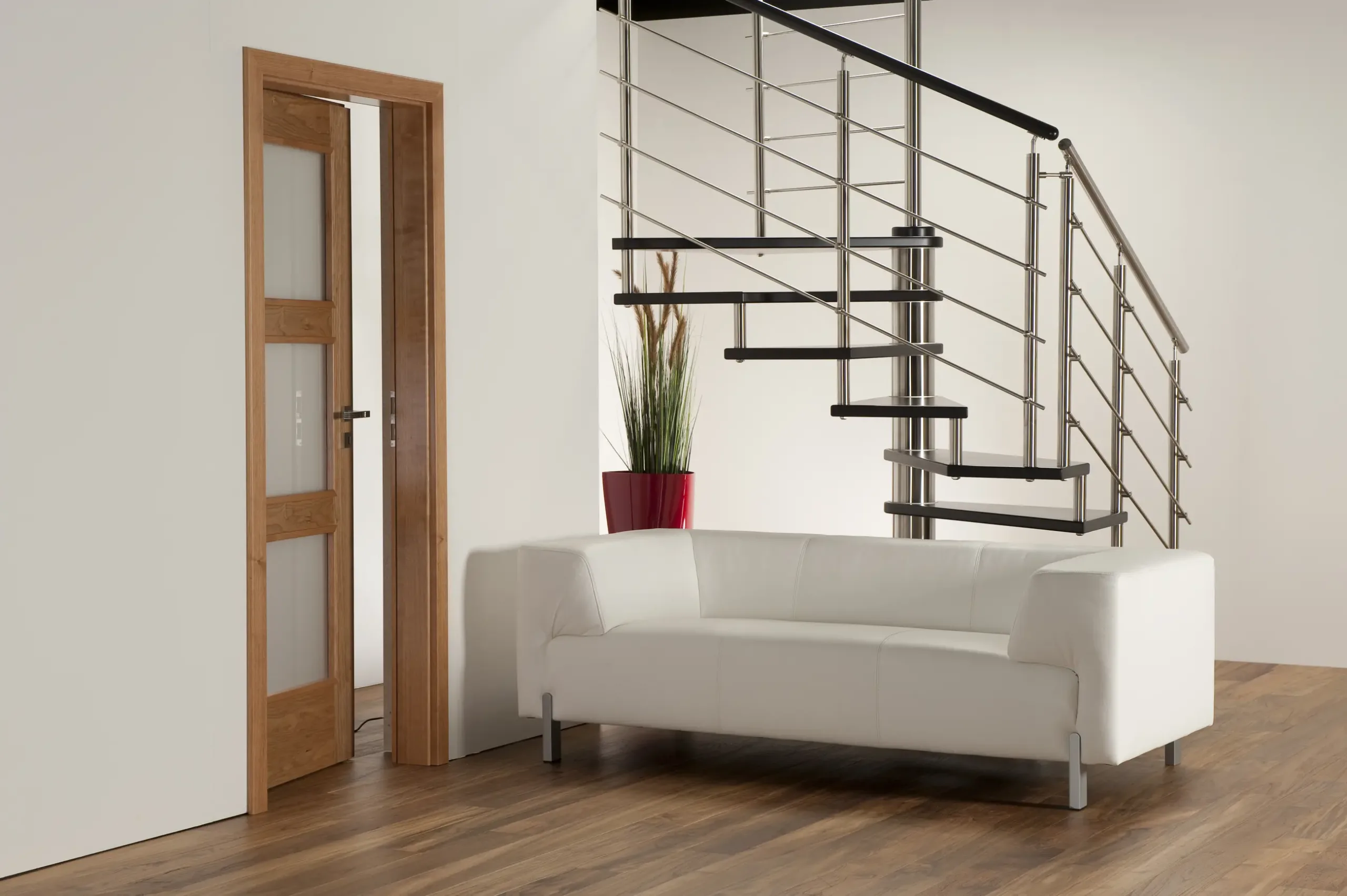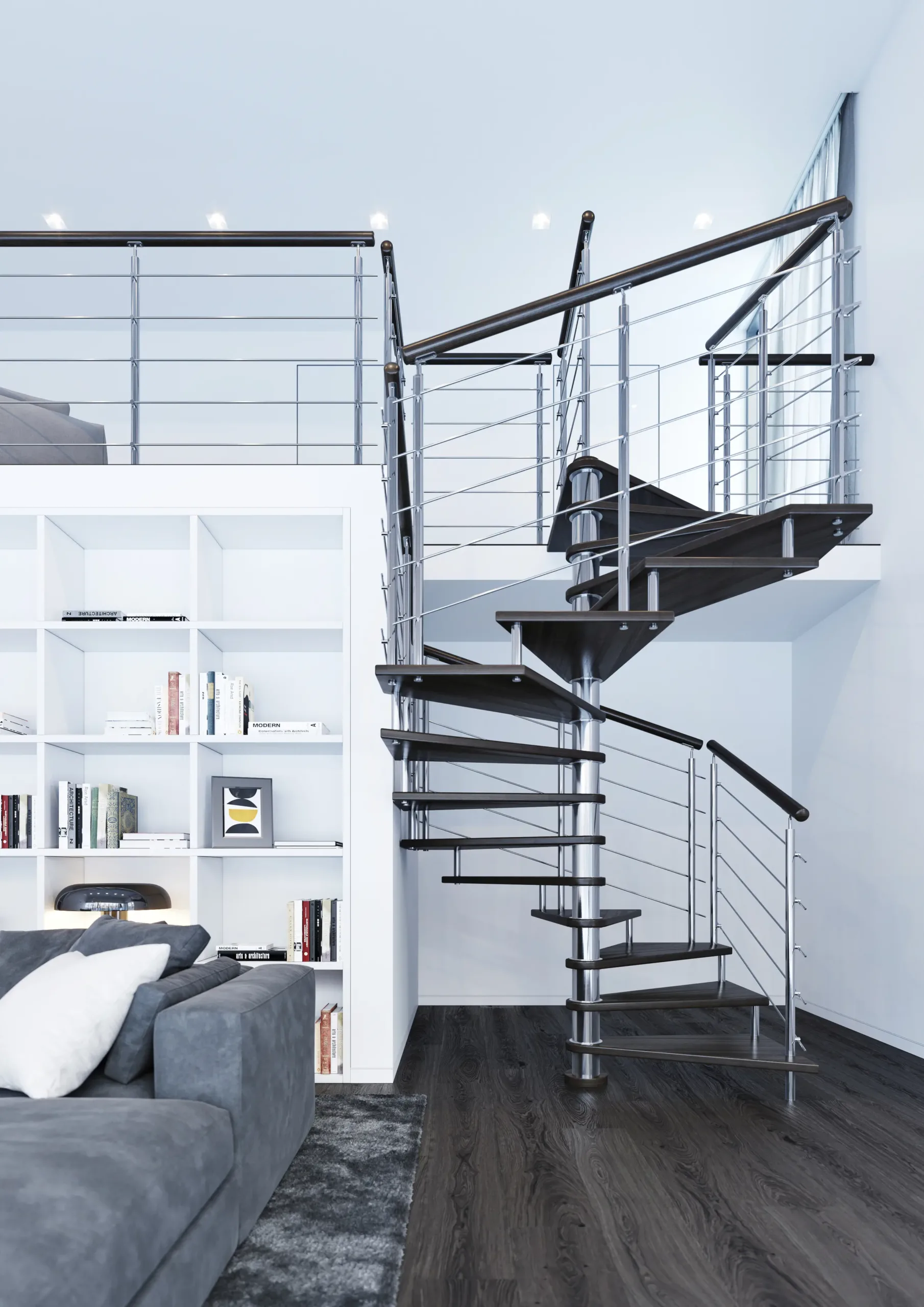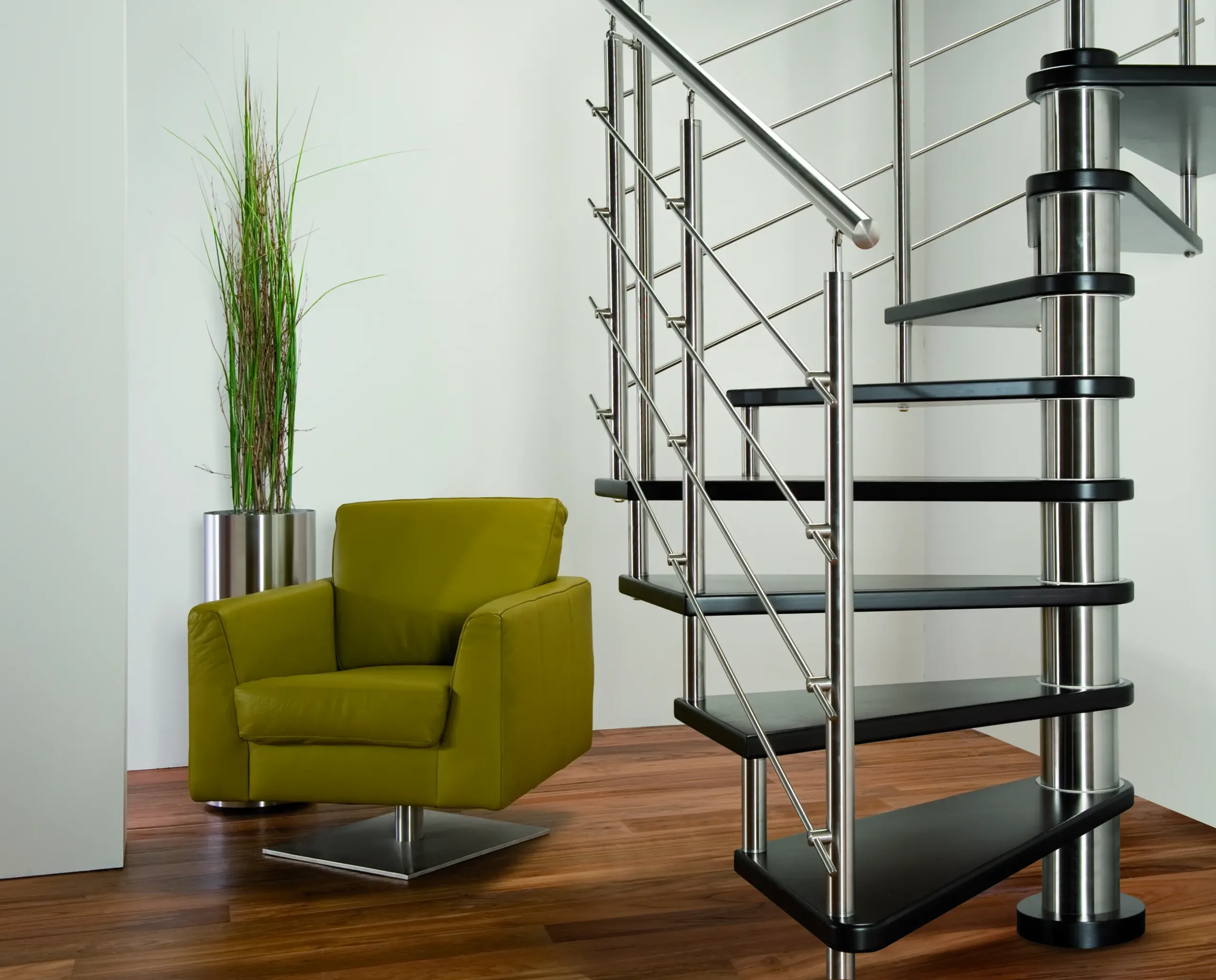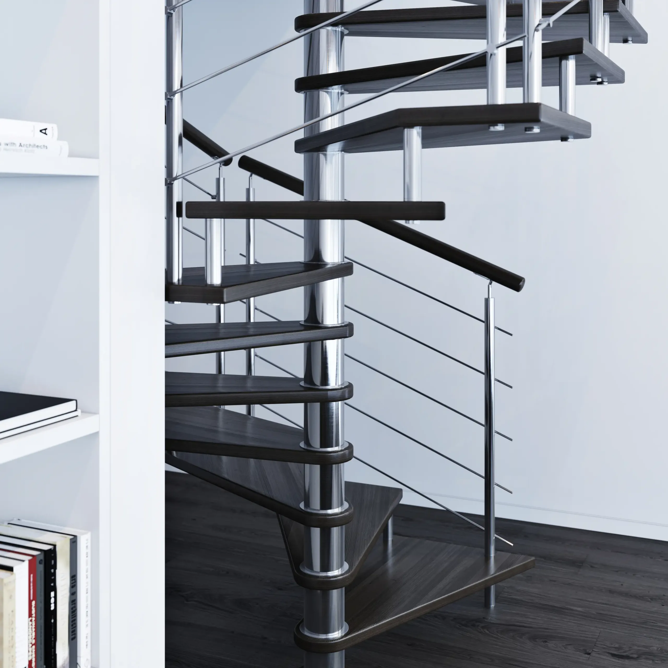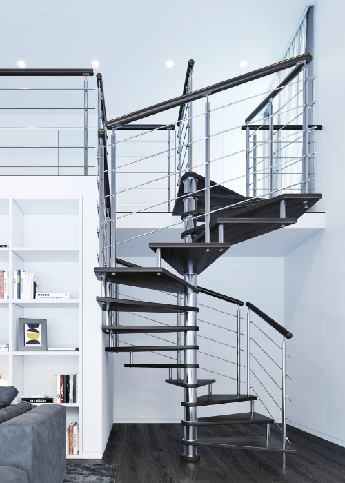 Nerezové točité schodiště MAX SQ s atypickým čtvercovým půdorysem je vhodné do téměř jakéhokoliv interiéru. Schodišťový stupeň je z masivního bukového dřeva.