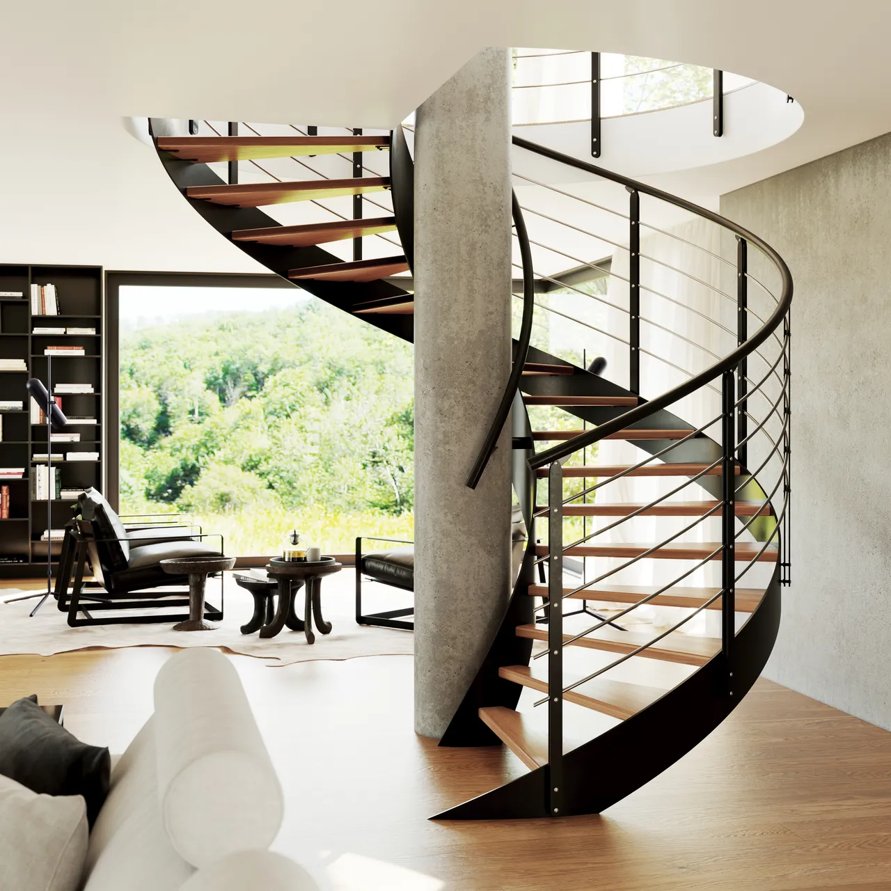 Konstrukce tohoto schodiště nevyžaduje podpěry, což umožňuje volný průchod světla a zachovává pocit prostornosti. V tomto konkrétním případě je vertikální výplň tvořena ocelovými pruty, což schodišti dodává industriální dotyk.