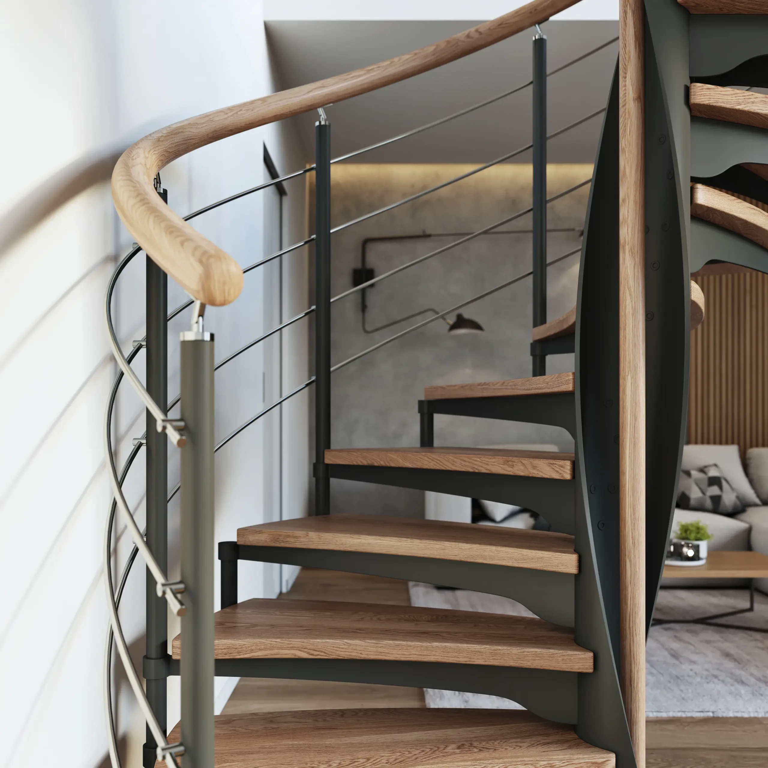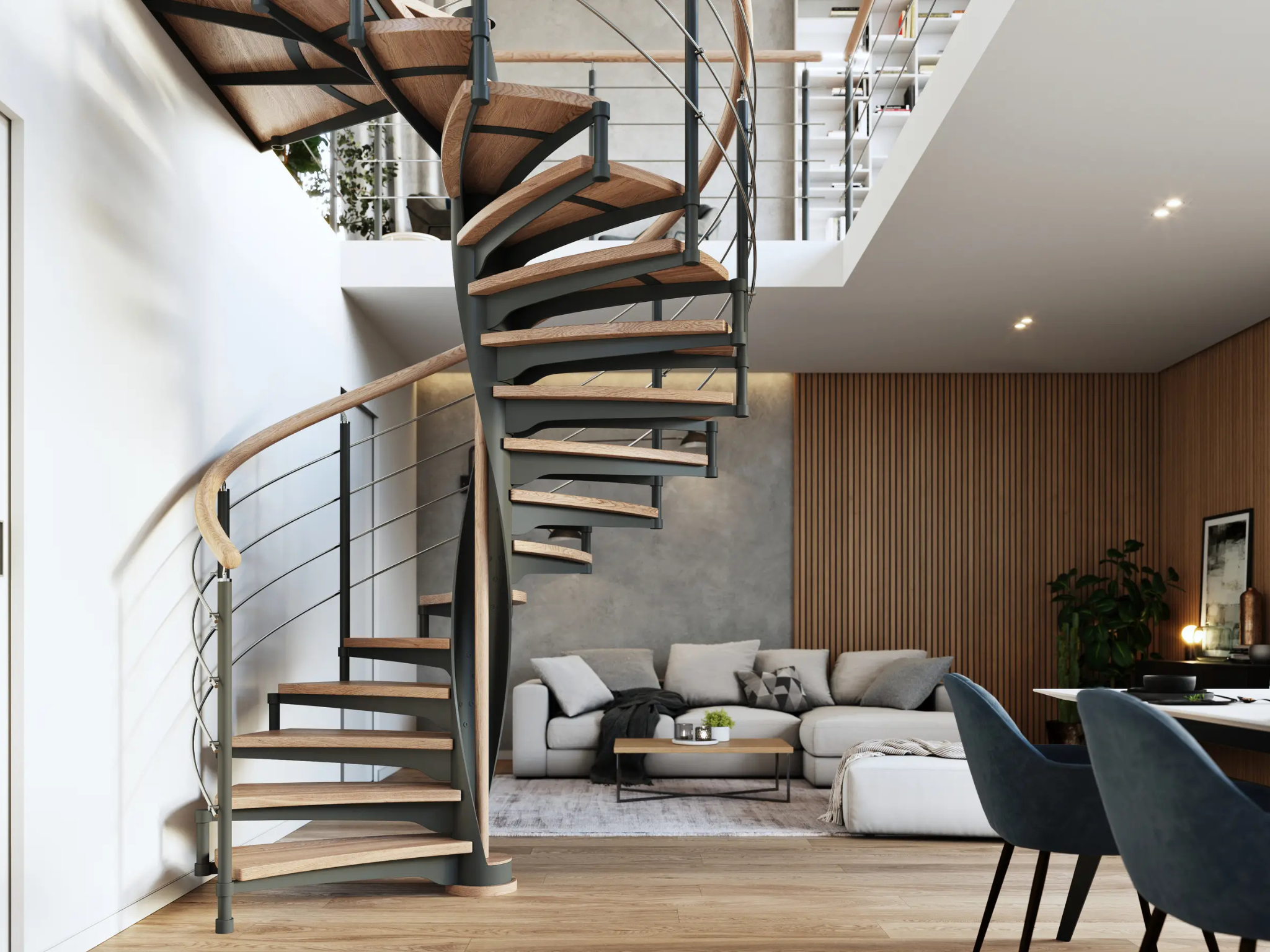 Konstrukce tohoto schodiště nevyžaduje podpěry, což umožňuje volný průchod světla a zachovává pocit prostornosti. V tomto konkrétním případě je vertikální výplň tvořena ocelovými pruty, což schodišti dodává industriální dotyk.