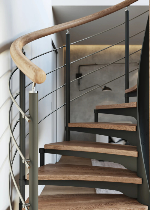 Dubové točité schodiště s ocelovou konstrukcí
