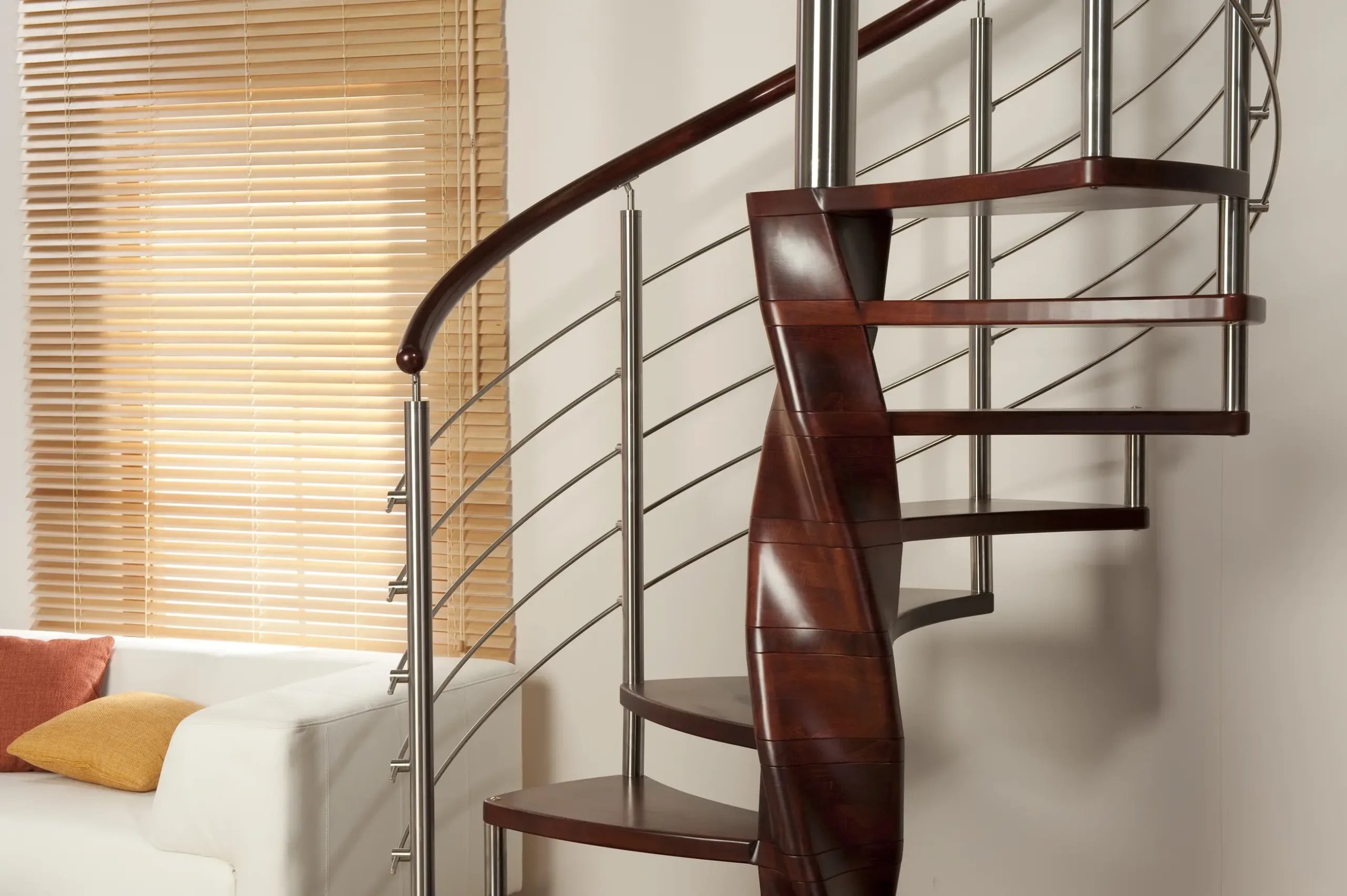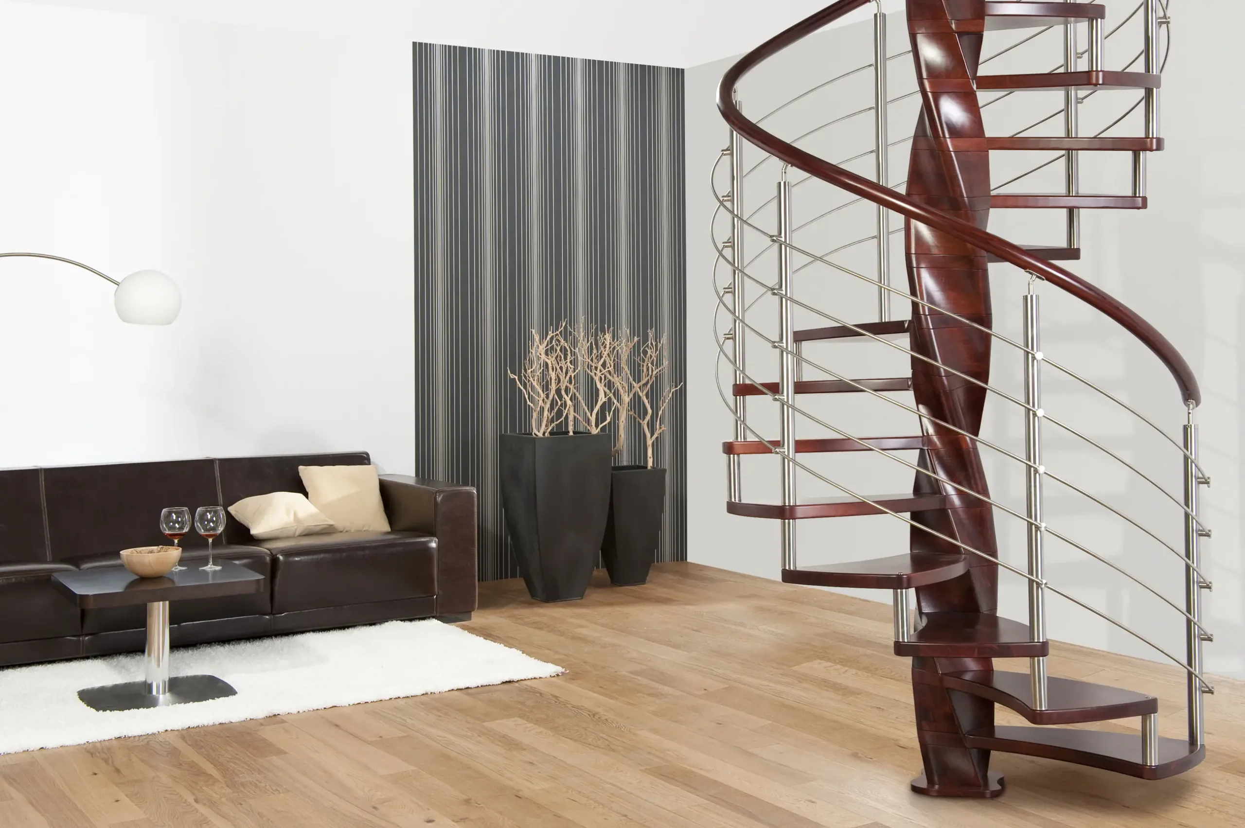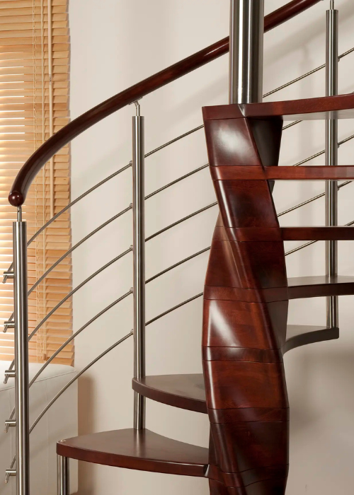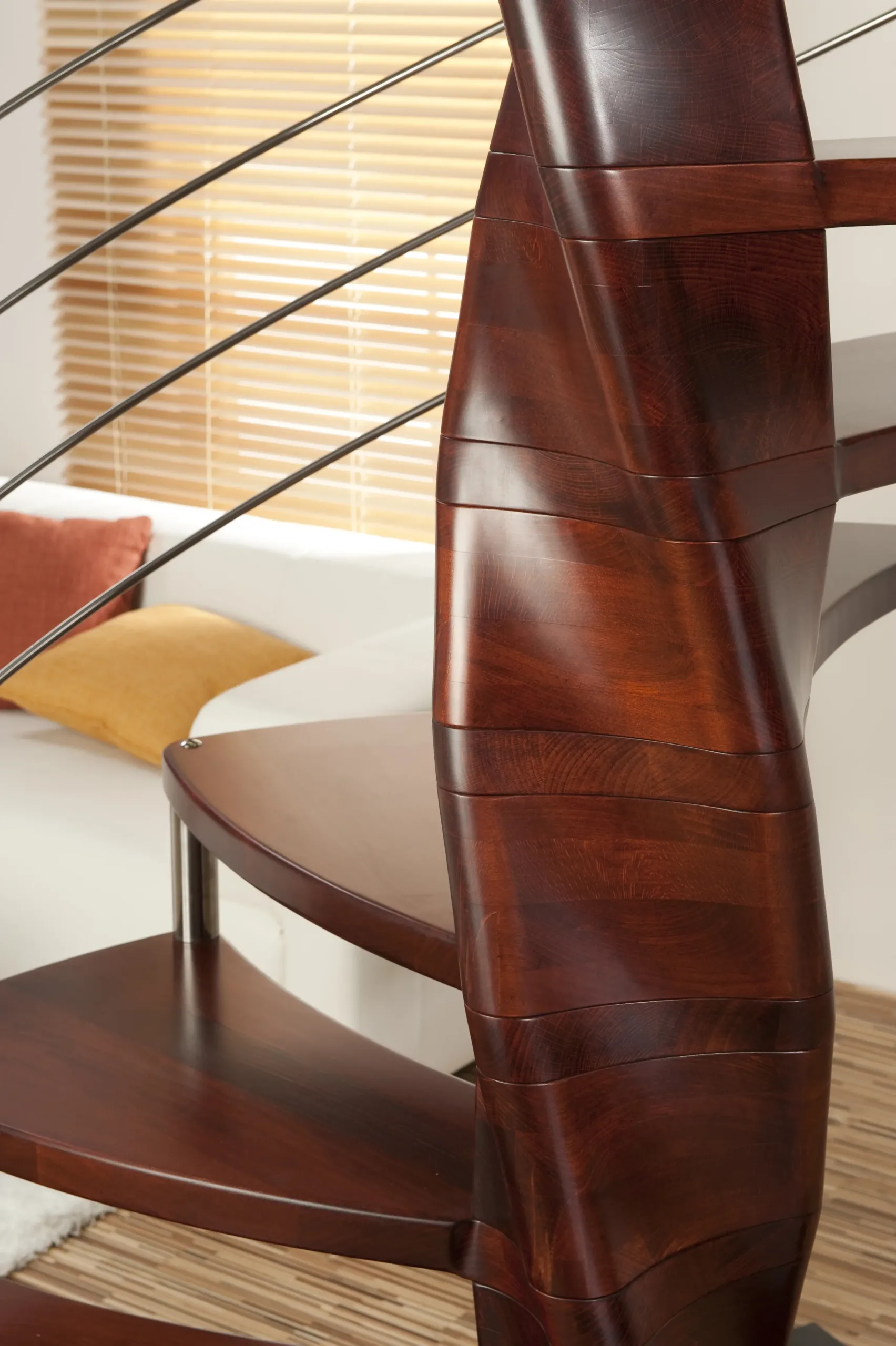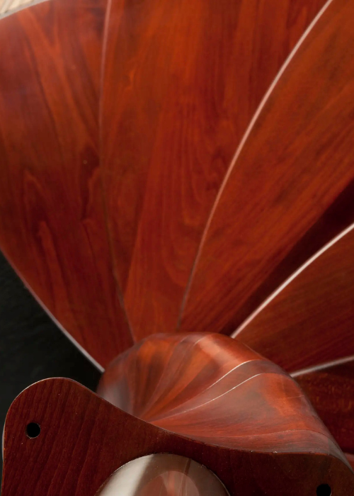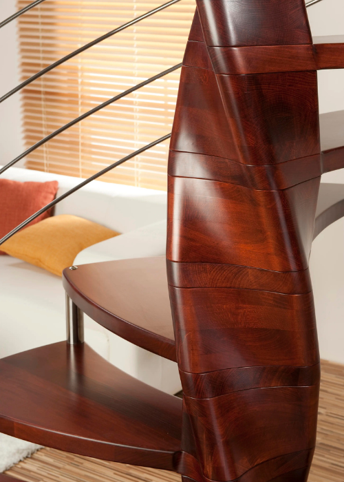 Luxusní kombinované točité schodiště TANGO je určené do interiéru. Nášlapy točitého schodiště Tango se obtáčejí kolem středového sloupu ve tvaru extravagantní dvoušroubovice, kterou tvoří masivní bukové dřevo.