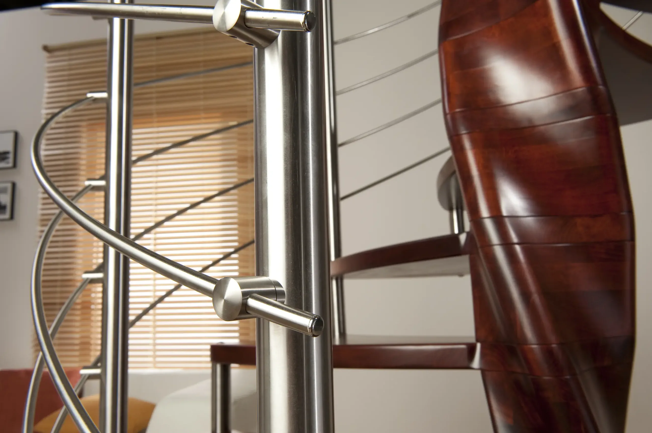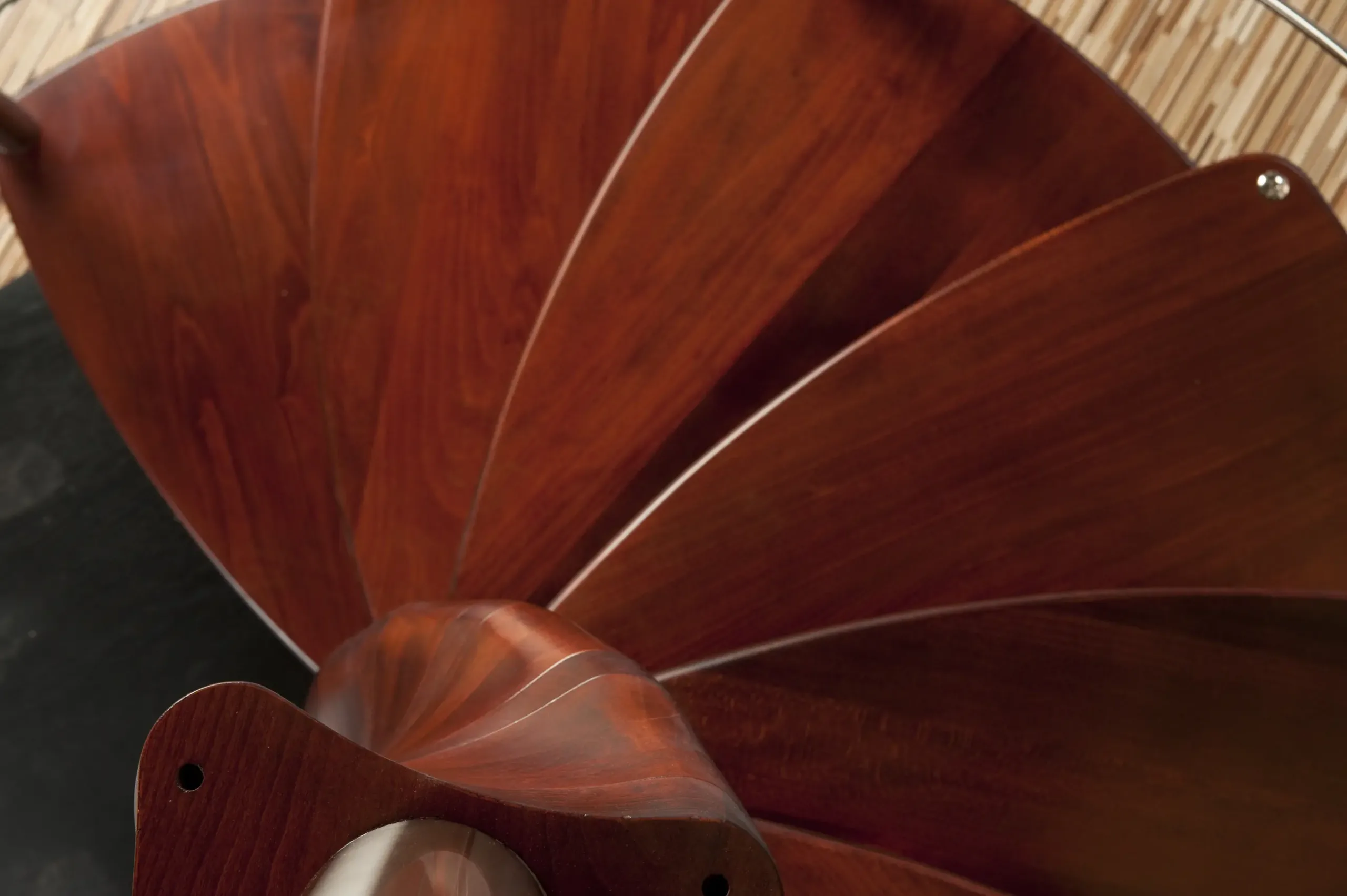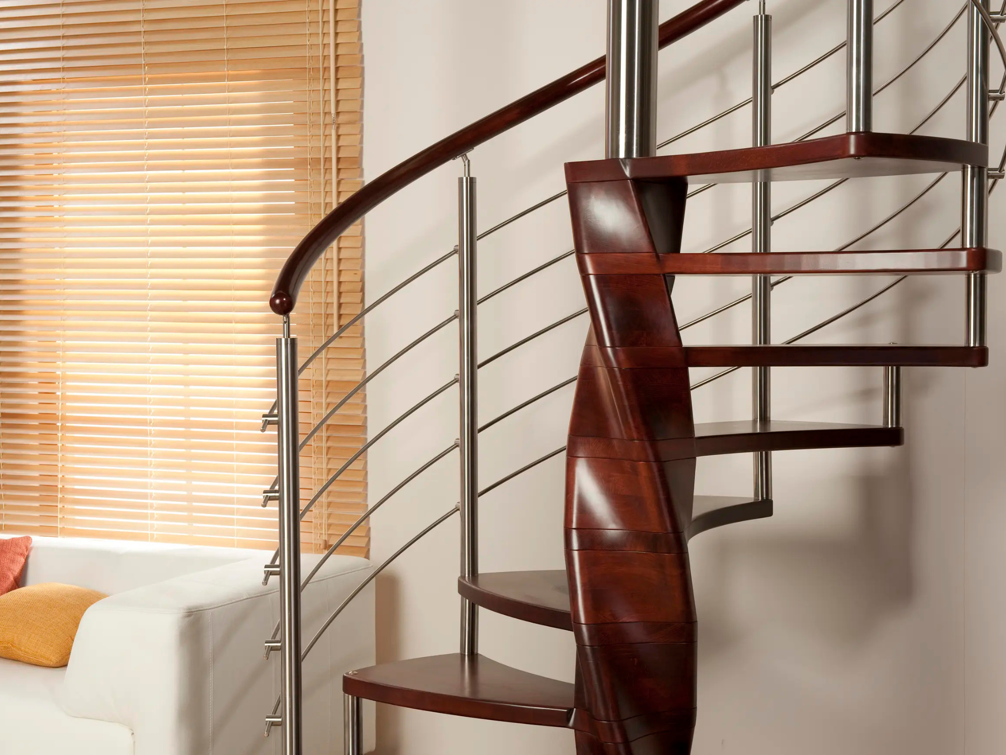 Luxusní kombinované točité schodiště TANGO je určené do interiéru. Nášlapy točitého schodiště Tango se obtáčejí kolem středového sloupu ve tvaru extravagantní dvoušroubovice, kterou tvoří masivní bukové dřevo.
