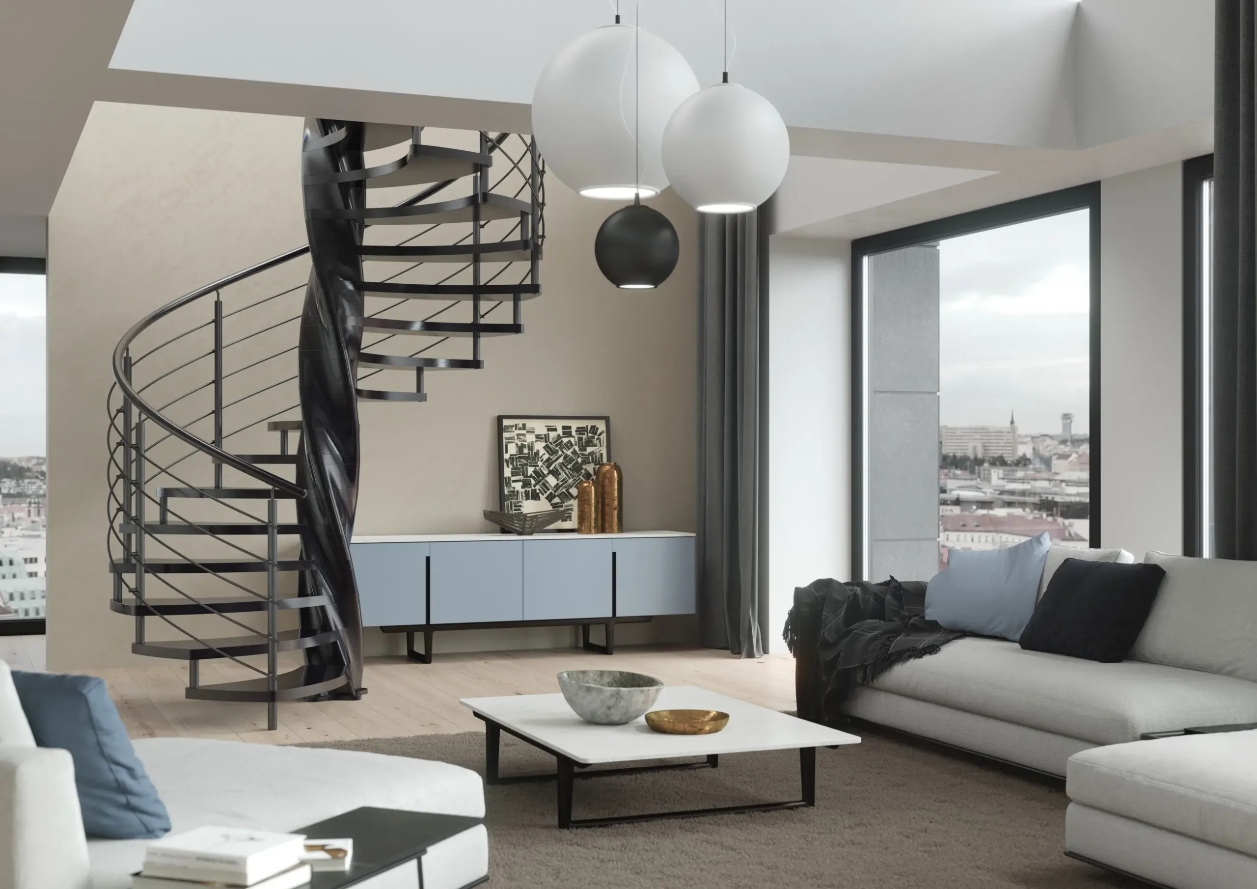 Samonosné schodiště s prutovým zábradlím je ideální pro moderní interiéry, kde chcete vytvořit vzdušný a otevřený prostor. Prutové zábradlí propouští světlo a zachovává pocit prostornosti, aniž by obětovalo bezpečnost.