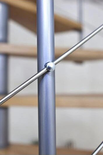 Toto robustní vřetenové schodiště bylo vyrobeno ze žárem pozinkovaného kovu, ale existuje také možnost varianty z pozinkovaného děrovaného plechu, nebo Trimaxu.